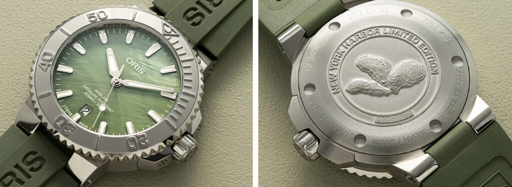La marca elvetica si è appassionata al progetto e, per sostenerlo, ha realizzato, in tiratura di 2000 esemplri numerati, una versione del suo Aquis Date in acciaio (cassa ø mm 41,5 w.r. a m.300, lunetta girevole unidirezionale in acciaio con scala dei minuti in rilievo, movimento Calibro Oris 733). Gli automatici della New York Harbor Limited Edition, disponibili dal Luglio 2022, hanno una finitura verde naturale che vuole ricordare il colore dell’acqua del porto e un quadrante in madreperla verde ispirato alle conchiglie delle ostriche. Il cinturino è in caucciù verde, ma si può sceglierlo anche con un bracciale in acciaio inossidabile.