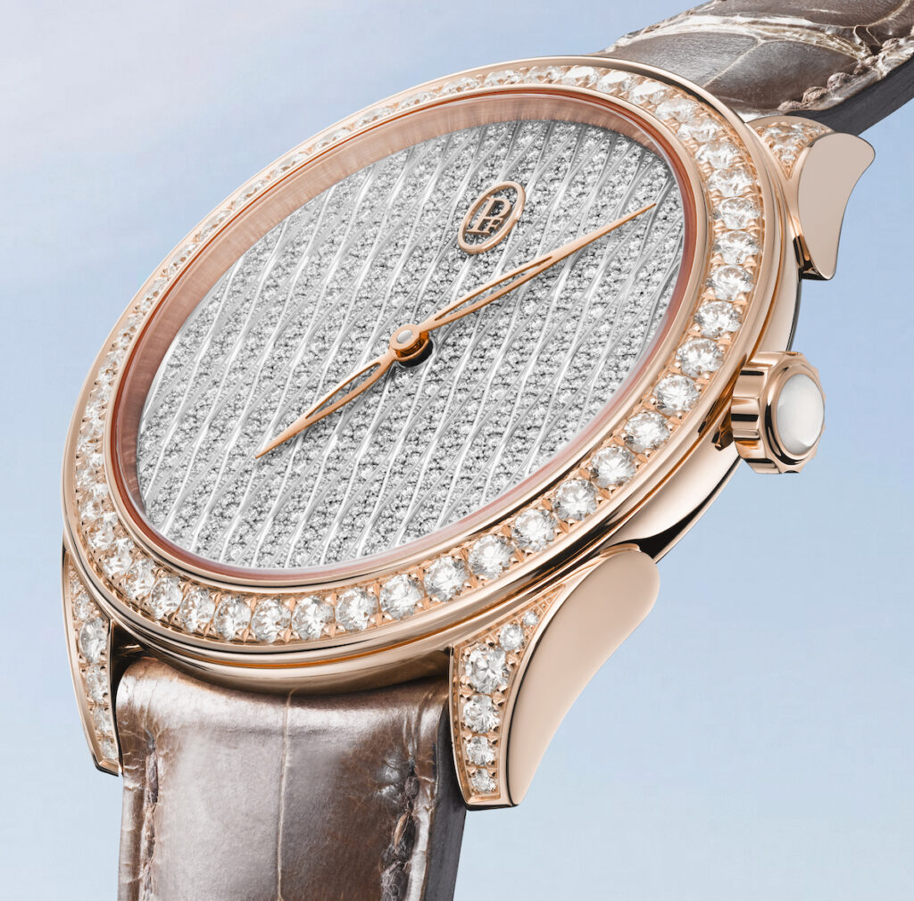 Nel caso del nuovo Tonda (Codice PFC802-2120001-300181) il quadrante bianco Full Pavé è lavorato a Grain d’Orge: le strisce verticali vedono incise, sulla base metallica, delle ogive (cioè la forma del grano d’orzo); a questo punto i diamanti sono stati incastonati a neve, utilizzando 979 pietre F-G VVS di diverso diametro (ben sette) per un totale di 1.21 cts. Abbiamo scelto una fotografia con il quadrante in primo piano e anche a occhio nudo si possono vedere questi dettagli che, ad ogni movimento del polso, si traducono in una sequenza sfavillante; alle 12 sul quadrante della cassa in oro rosa è applicato il logo PF in oro rosa mentre per quella in oro bianco è in oro trattato PVD blu; le lancette, molto eleganti e slanciate, sono a foglia.