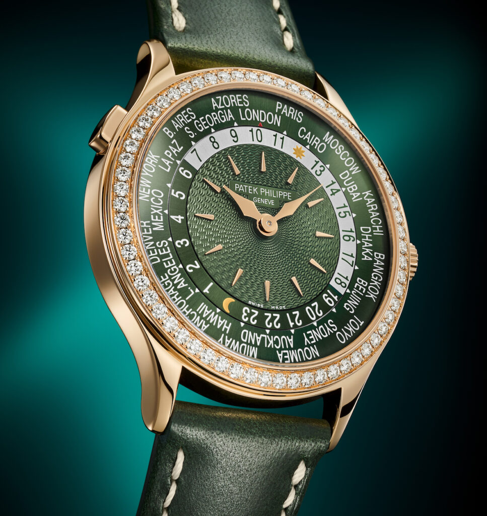 Three new Patek Philippe for Ladies: steel Twenty-4 with olive green dial, white gold and blue dial for Moon complication and gold case and olive green for World Time.