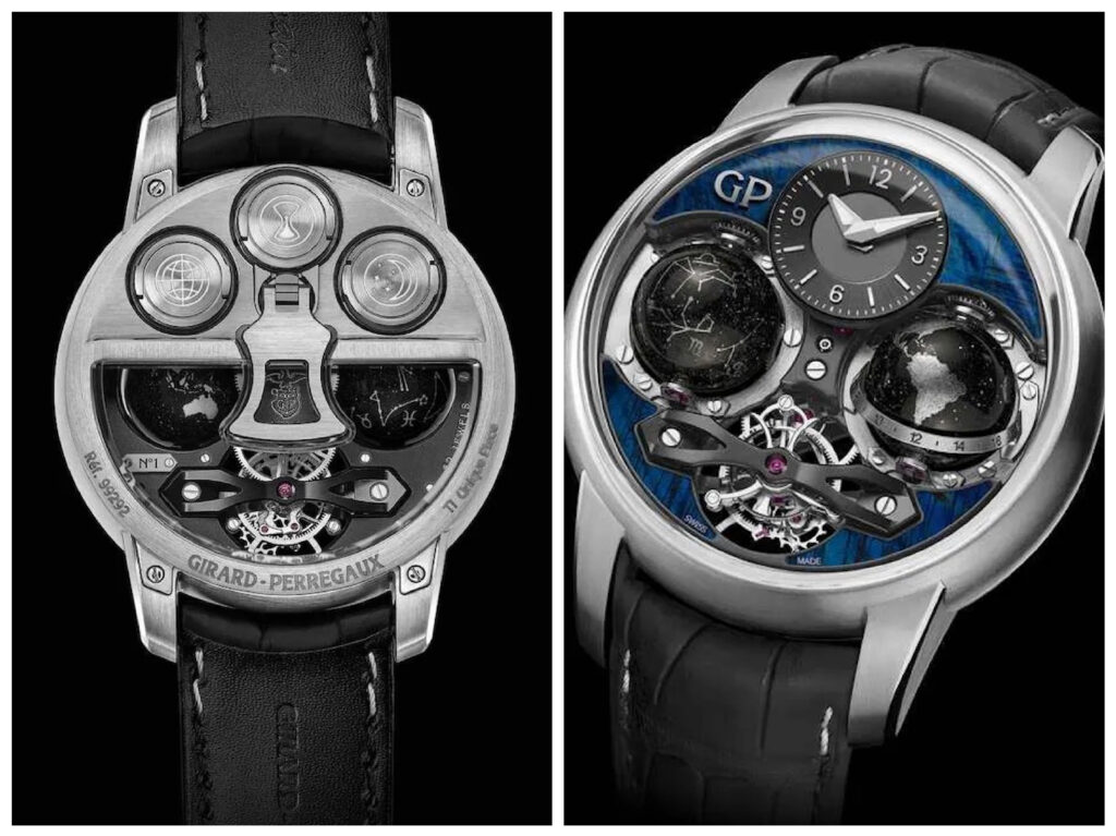 La cassa di questi segnatempo ø 47 mm è in titanio grado 5, ma ciò che attira l’attenzione è il quadrante, realizzato in due parti, impiegando avventurina, ossidiana e spectrolite sul quale risaltano a ore 3 il globo terrestre (che indica il giorno e la notte) e quello celeste che, a ore 9, mostra le costellazioni zodiacali (entrambi in avventurina nera e avventurina nera e onice sono dipinti a mano con la tecnica della micropittura dorata che richiede un tempo di almeno 14 ore). Alle ore 6 ruota la gabbia del tourbillon. Non è facile vedere a occhio nudo la differenza fra le rotazioni dei globi, uno in 24 ore e l’altro in 23 h e 56′, ma anche questo dettaglio (per altro non trascurabile) è stato risolto; un altro particolare riguarda la corona che è stata spostata sul retro degli orologi adottando un sistema di carica e regolazione impiegato all’epoca dei Tasca, le tre incisioni sono riempite con materiale luminescente. Il movimento è il Calibro GP093020 a carica manuale con riserva di carica di 57 h, la platina principale è trattata PVD nero con finitura perlage, anglage e smussata; la gabbia del tourbillon a forma di lira, è in titanio e mantiene in posizione il Neo Bridge, interpretazione moderna del ponte a forma di freccia disegnato nel XIX secolo. I tre pezzi unici sono in vendita esclusiva da The Hour Glass nel mese di Dicembre 2022.