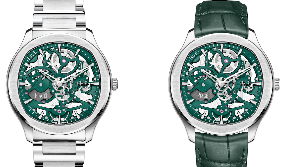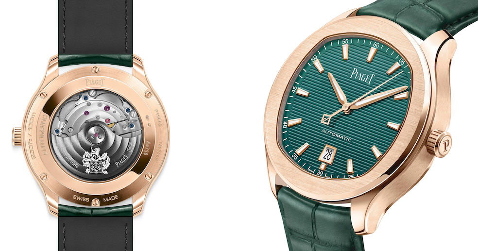 La collezione del Polo dunque è perfetta per il verde sia pensando ai campi dove si disputa questo sport equestre, sia per via delle colline de La Côte-aux-Fées. dove la Maison è stata fondata. Due le versioni di questo nuovo Piaget: il Polo Date ha la cassa in oro rosa (g 69,14, ø 42 mm, spessore mm 9,4 w.r. a 10 ATM) mentre il Polo Squelette è in acciaio (ø 42 mm, spessore 6,5 mm w.r. a 3 ATM).. Il fondo di entrambi è in vetro zaffiro; il modello in oro ha un cinturino in alligatore coordinato al quadrante che è lavorato a strisce orizzontali, mentre lo squelette ha il bracciale in acciaio, facilmente sostituibile con un cinturino verde in alligatore.