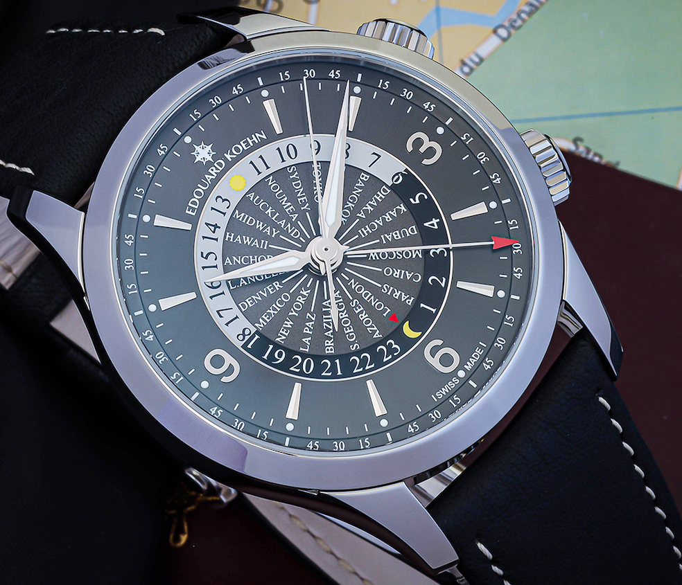 Nel 2020 la famiglia di Bernard Fleury, che a La Chaux-de-Fond aveva già fatto rinascere Vulcain, realizza nel 2021 una serie di orologi E.K.Heritage, nasce così questo orologio proposto ai soci da The Swiss Ckyb, un’Heure Universelle con funzione di svegliarino e suoneria meccanicanica programmabile. La cassa, ø 42 mm in titanio grado 5 accoglie un movimento automatico con doppio bariletto su base Concepto, modificata per Edouard Koehn, realizzato a La Chaux-de-Fond; le A/h sono 28.800, i rubini 31; carica 48 h, massa oscillante su cuscinetti a sfera in ceramica: tre le versioni disponibili con quadrante argenté, nero o antracite.