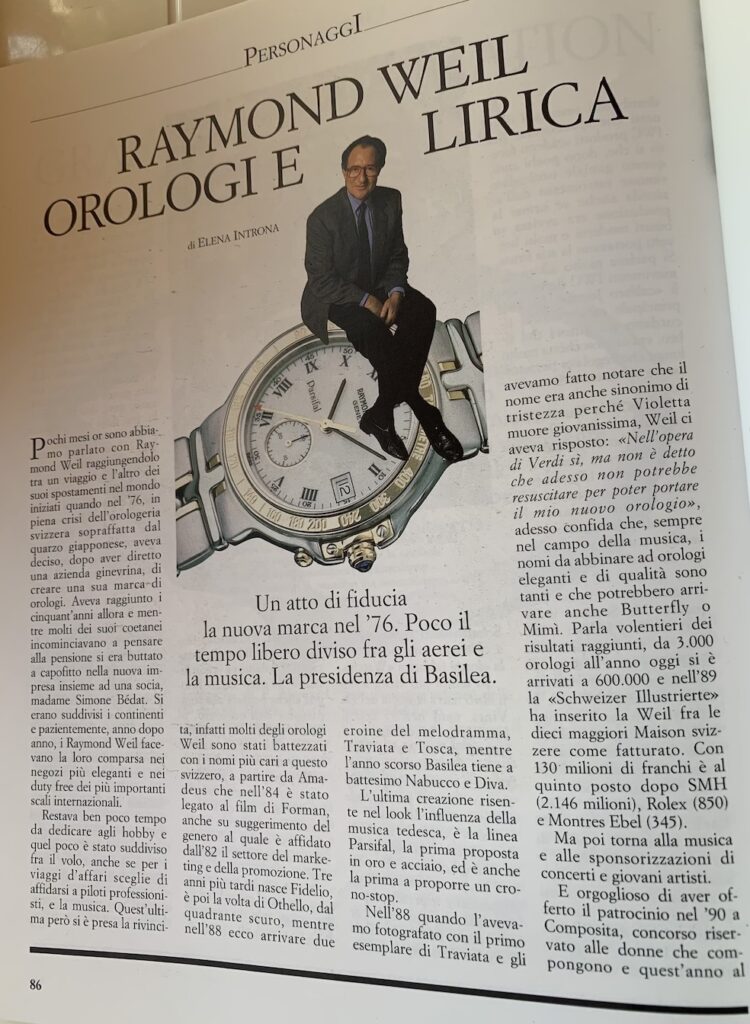 Nel 1990, a VicenzaOro ho conosciuto il capostipite di questa generazione imprenditoriale indipendente. Raymond Weil, nel 1976, con la socia Simone Bédat aveva lanciato una sfida all’invasione degli orologi giapponesi. Anche i suoi erano al quarzo, ma l’estetica e il buon gusto erano tutti europei e si affiancavano a prezzi accessibili. Aiutato anche dal genero Bernheim, esperto di marketing e appassionato di musica (non per nulla aveva sposato la figlia di Raymond valentissima pianista) aveva consigliato il suocero di chiamare Amadeus un orologio affiancandolo alla celebre pellicola cinematografica, aperto shop in moltissimi aeroporti e, con la Elmitex, allora distributore in Italia di RW, aveva fatto indossare al personale femminile della Fiera viecntina il modello Traviata. Allora gli avevamo fatto notare che il finale dell’opera verdiana era triste, ma ci aveva risposto “da Verdi sì, ma non è detto che adesso non potrebbe resuscitare per portare il mio nuovo orologio“. Anche in seguito aveva mostrato il suo spirito ironico chiamando un segnatempo Don Giovanni Così Grande, oppure facendo realizzare a forma di violoncello lo stand di Basilea dove, dopo i suoi primi successi, negli anni 70/80, era stato nominato presidente degli espositori del Salone.
