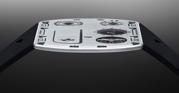 Realizzato in collaborazione con Audemars Piguet Le Locle (dagli inizi della sua produzione Richard Mille è legato alla Maison AP), l’ RM UP-01 Ferrari non è solo ultrasottile, ma è anche ultraleggero, il peso dell’orologio è di soli 30 grammi. In titanio grado 5, sempre nella forma tonneau cara ai modelli RM, presenta uno sviluppo in orizzontale, con i componenti montati all’interno della cassa che funge da platina. È stata una sfida a colpi di millimetro con Marchi, che dei movimenti meccanici spiatti e ultrapiatti hanno fatto il loro fiore all’occhiello, da Piaget capostipite, sino ai mm 1,80 record mondiale del Finissimo di Bvlgari.