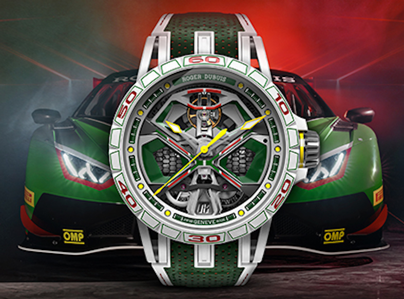 In questa versione, sempre in collaborazione con il Team Lamborghini Corse, molti dettagli nascono dalle esperienze maturate nei circuiti e in particolare dalla Huracán GT3 EVO2. A partire dalla cassa, ø 45 mm. Se le auto sono in fibra di carbonio nell’orologio cassa, lunetta e corona sono in MCF (Mineral Composite Fibre). Sviluppato in esclusiva all’interno della Manifattura, lavorando il silicio con il processo di Sheet Molding Compound (SMC) che consente di avere un materiale del 13% più leggero del carbonio SMC questo materiale è particolarmente leggero e molto resistente. E ancora il motivo a nido d’ape reso famoso dalla supercar e la forma del calibro che riproduce quella del cruscotto esagonale. Sotto il profilo orologiero nel Calibro RD630 automatico ci sono due bariletti gemelli, la ruota del bilanciere inclinata a 12° garantisce una carica di 60 h, le A/h sono 28.800, i rubini 29; platina principale sabbiata; ponti sabbiati e allineati, con rivestimento NAC; il movimento scheletrato visto dal retro mostra la massa oscillante a 360°, disegnata come il cerchione di una Hurácan; la corona si ispira ai dadi delle ruote delle supercar ed è abbinata a un ponte, sulla parte superiore del movimento, che ricorda le barre-duomi del motore V10. Da buon ultimo il colore bianco, ripreso anche nel cinturino intercambiabile rapidamente, in caucciù e pelle traforata che mostra dettagli verde, rosso e giallo, i colori della GT3 EVO.