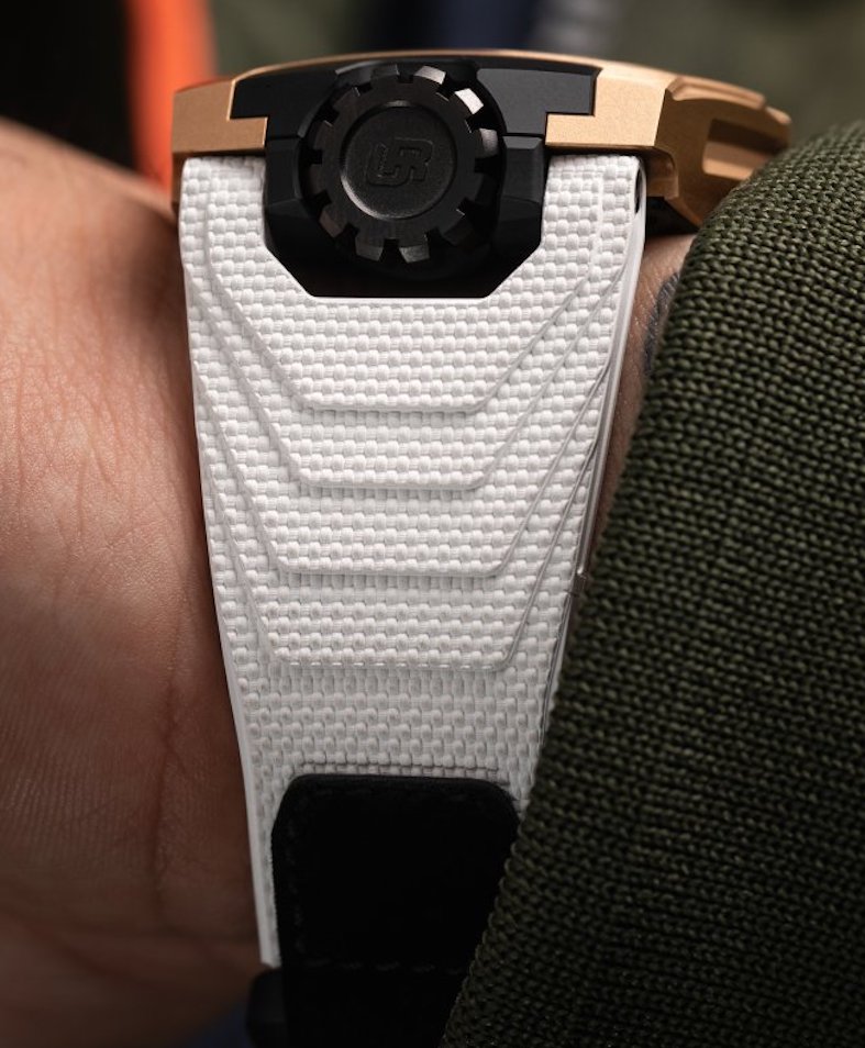 Per Felix Baumgartner invece la preziosità della cassa e il caucciù del cinturino, chiuso con il velcro, danno all’orologio un carattere molto forte, accentuato da alcuni dettagli. L’indicazione satellitare sugli UR-Werk è brevettata e indica le ore su tre cubi rotanti, con autonomia di 48h. Sul 220 Red Gold l’indicazione della riserva di carica, abbandonata dopo le prime versioni, torna sul sistema satellitare in forma digitale (la cui unità è il mese) con due rulli vicini, ognuno di 24 h, quello a destra dopo la carica manuale indica le ore, quello di sinistra entra successivamente in funzione con i minuti che si leggono a retrograde. Quando si rende opportuno il “Change Oil”, sul retro dell’orologio, il proprietario rimuove il perno di protezione attivando il pulsante che mostra la durata del meccanismo; dopo 39 mesi, cioè tre anni e tre mesi; il cambio d’olio è eseguito dal servizio di assistenza che risistemerà il perno al suo posto. Il sistema, composto da 83 elementi meccanici è molto complesso, fornisce anche la possibilità di conoscere per quanto tempo l’orologio sia stato indossato. Il movimento è il calibro UR-7.20 sviluppato da UR-Werk, i rubini sono 59, carica 48 h, 28.000 A/h, un bariletto.