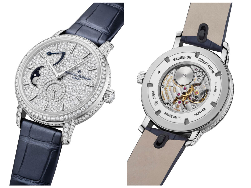 Uno sfavillante orologio gioiello con 225 diamanti sulla massa e sulle anse e 548 incastonati a neve sul quadrante; la complicazione delle fasi lunari è di precisione, solo dopo 122 anni occorre intervenire per adeguare alla realtà l’immagine; cassa in oro bianco, ø 37,5 mm, fondello trasparente, corona con un diamante; il movimento sviluppato e prodotto da Vacheron Constantin è il Calibro 1410 AS meccanico a carica manuale, spessore mm 4,2 con indicazione della riserva di carica in madreperla, carica circa 40 h. 22 rubini, A/h 28.800, Punzone di Ginevra; cinturino in alligatore blu notte con fibbia in oro e 21 diamanti; in totale le pietre preziose sono pari a 4,8 carati.