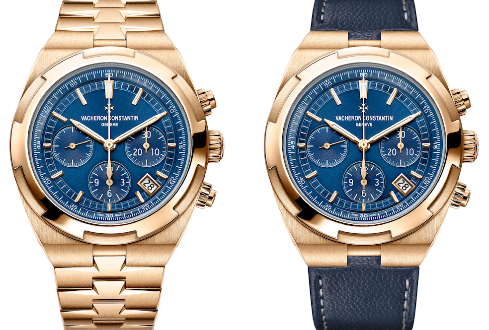 Nella foto sopra le versioni del nuovo Overseas, certificato Punzone di Ginevra, in oro rosa con l’analogo bracciale o il cinturino (scelta secondo noi molto più chic). In entrambe ciò che attira maggiormente l’attenzione è il quadrante laccato traslucido blu, finitura satinata soleil e rehaut con finitura effetto vellutato; i contatori sono azzurrati, indici e lancette di ore e dei minuti in oro rosa trattati Super-LumiNova® blu con finitura satinata. Nella Cassa ø 42,5 mm, spessore mm 13,7, w.r. a circa m.150, un anello in ferro dolce garantisce la protezione antimagnetica; il fondello è in vetro zaffiro, la corona è a vite, pulsanti avvitati di 1⁄4 di giro; il movimento è il Calibro automatico 5200 con ruota a colonne, sviluppato e prodotto da Vacheron Constantin; 13”’1/4m spessore mm 6,6, A/h 28.800, rubini 54, massa oscillante Overseas in oro 22 carati, carica 52 h, Il bracciale in oro rosa con maglie lucide e satinate a forma di mezza Croce di Malta, chiusura deployante; cinturino in pelle blu cucito in grigio o in caucciù con fibbia in oro rosa.