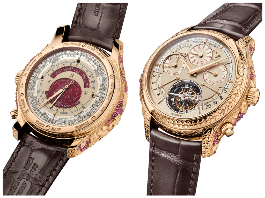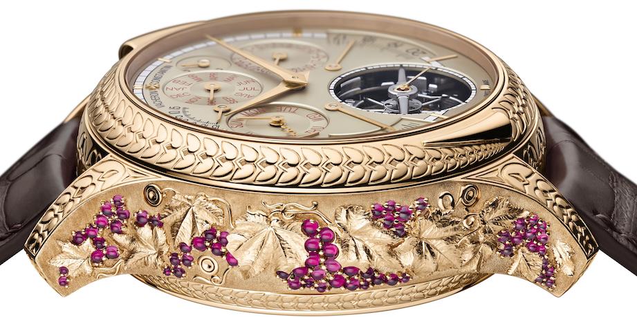 A unique piece, Bacchus with double dial, unveiled by Vacheron Constantin on January 2022; two jewellers worked for more than 300 hours to realize gold carrure with hand made vine leaves and bunches of red ruby grapes.