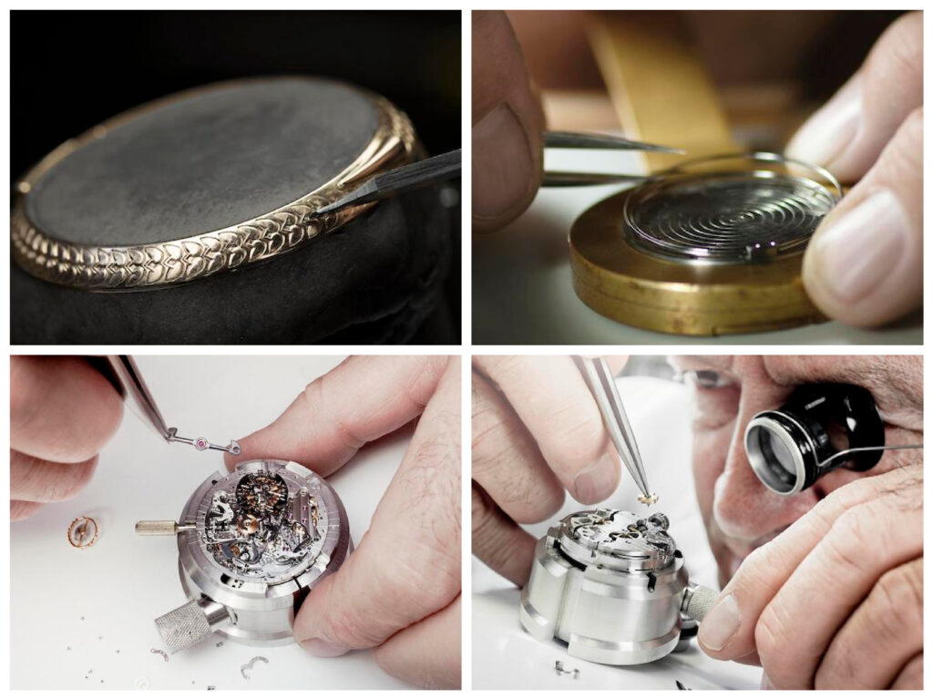 Volendo proseguire a ruota libera. potremmo anche dire, parafrasando i versi del Manzoni, s’ode a destra uno squillo di trova, a sinistra risponde uno squillo…”, meno di un mese fa infatti Patek Philippe ha presentato la Ref.5750P, ma tornando seri, ecco alcuni particolari sulla tecnica delle foglie di vite intagliate a mano. Prima di affrontare la lavorazione sulla cassa definitiva, è stata eseguita una prova su una carrure preparata precedentemente. Con la tecnica del bassorilievo si creano delle cavità nel metallo scavando con un bulino per far risaltare meglio il motivo delle foglie; per formare i grappoli sono stati usati rubini di 5 diverse dimensioni da posizionare nelle 113 cavità previste, poi è subentrato l’esperto per incastonare le pietre cabochon con una tecnica che combina l’incastonatura a griffe con almeno tre punti di fissaggio. In quanto alle foglie la difficoltà maggiore è stata quella di dover lavorare seguendo l’incisione calcografica cioè in assenza di un bordo o di una linea di contorno, tenendo presente la necessità di una regolarità costante nell’elemento della ghirlanda, l’effetto tridimensionale è stato ottenuto martellando la superficie dell’oro così da presentare una superficie sabbiata sulla quale risaltasse perfettamente quella levigata delle foglie.