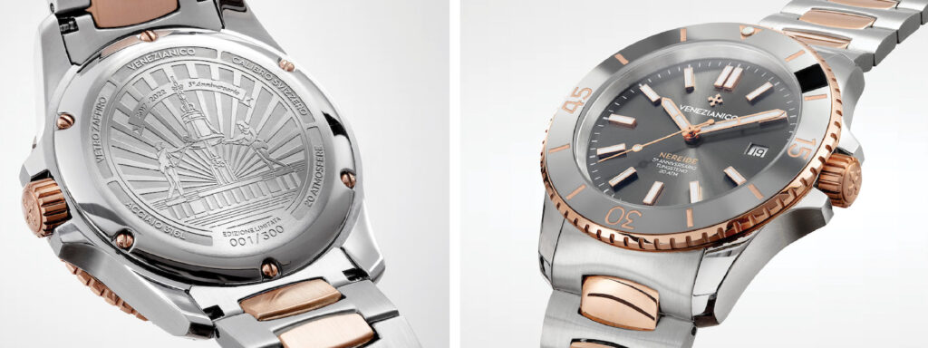 In quanto al Nereide “Anniversario” di Venezianico queste le caratteristiche tecniche: cassa ø 42 mm w.r. a m.200, in acciaio 316L come il bracciale, lunetta con inserti in tungsteno, 120 scatti, movimento Sellita SW200-1, Swiss Made, vetro zaffiro indicazioni luminescenti BGW9 Super-LumiNova.
