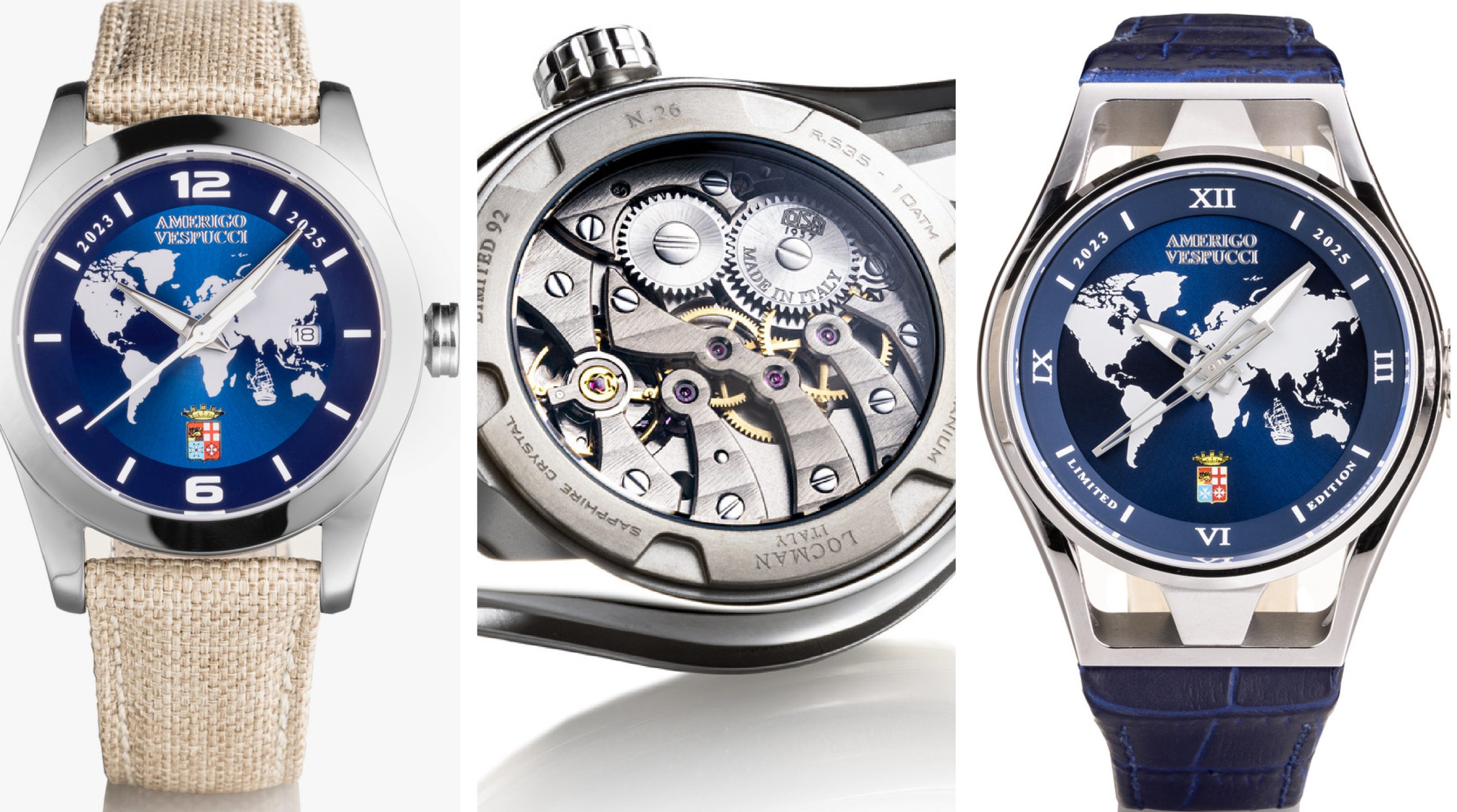 A completare la manifestazione ci saranno, sul cielo genovese, anche le Frecce Tricolore, ma se SoloPolso rende omaggio alla Vespucci lo fa anche perché a bordo ci sarà un ospite speciale, un orologio Locman realizzato in accordo con la Marina Militare per ricordare con tre modelli di una collezione dedicata, il Giro intorno al mondo della Vespucci. Il numero Zero della versione più interessante – a sinistra e al centro della foto sotto, è in tiratura limitata – ha un movimento a carica manuale Oisa 1937 29-50, visibile dal fondo in vetro zaffiro, coni 19 rubini sui cinque ponti, sulla platina in riferimento ai perni delle ruote, dove lavorano i perni del bilanciere, sul bariletto, sulla ruota corona, sull’ancora e sul plateau del bilanciere; la cassa della collezione Montecristo è w.r. a m.100 (nel modello con il movimento al quarzo è invece w.r. a m.50); la seconda versione ha un movimento tre sfere automatico Sellita SW 200; 26 rubini stop-secondi, carica 41 ore e massa oscillante in tungsteno personalizzata Locman. mentre la terza, come detto, ha un movimento al quarzo.. Tutti e tre i quadranti sono smaltati blu e mostrano i continenti toccati durante il Giro intorno al mondo, al loro interno l’immagine della nave, il logo a colori dell’Amerigo Vespucci e il Jack (la bandiera di bompresso sulle navi da guerra quando sono all’ancora) della Marina Miltare.