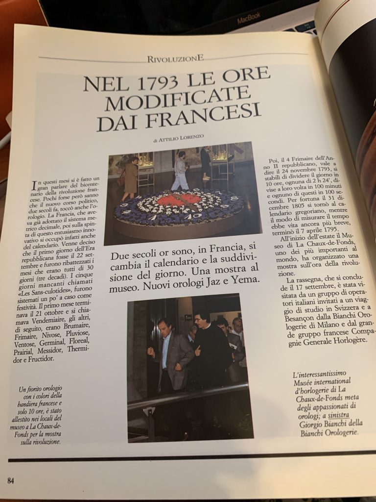 Ma nel 2023 tutta la Francia orologiera dovrebbe ricordare un altro anniversario, infatti, a prescindere da quello della Rivoluzione francese, nel 1793 fu adottato un nuovo modo di leggere le ore, diventate decimali. La rivista orologi da POLSO, insieme ad altri giornalisti, fu invitata (da Bianchi Orologerie di Milano e dal Gruppo franese Compagnie Génerale Horlogère a visitare sia la mostra organizzata nel M.I.H. di La Chaux-de-Fonds nel 1989, sia Besançon capitale dell’orologeria d’Oltr’Alpe).