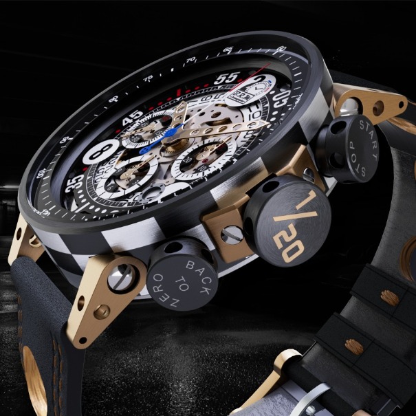 Già perché una delle caratteristiche di questi venti esemplari, è data dai materiali impiegati impiegati per la cassa ø 44 mm (titanio a damier) anse in bronzo, pulsanti e corona in acciaio trattati PVD nero; quadrante scheletrato e fondo con vetro zaffiro dal quale ammirare il movimento automatico Calibro Valjoux 7753. E per chi non conoscesse il francese ricordiamo che “damier” è un disegno che riprende quello della scacchiera con i suoi colori bianco/nero.
