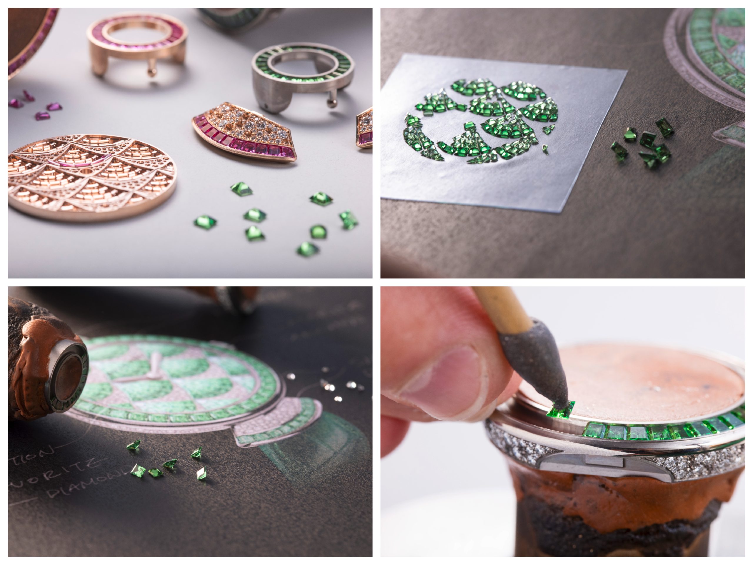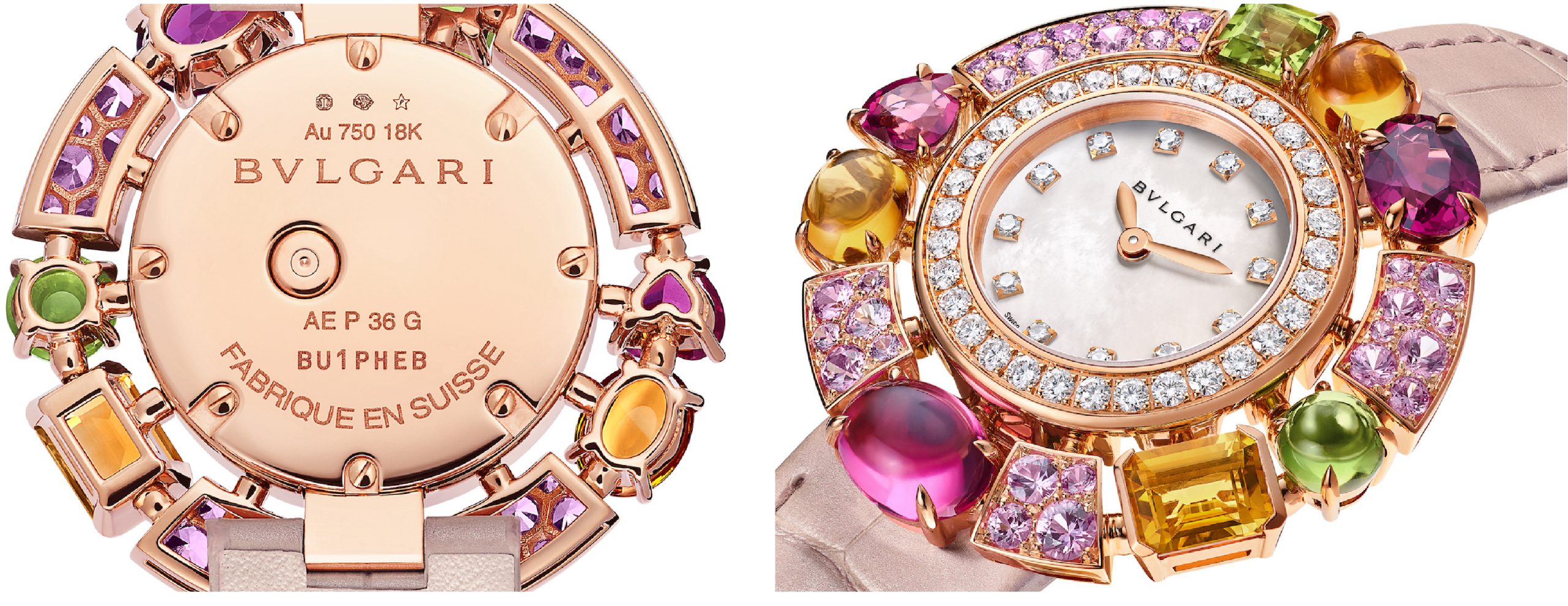 Le due versioni, Ref 103713 e Ref.103714, con cassa in oro ø 36 mm, hanno movimenti al quarzo, quadrante in madreperla e indici in diamanti, ma, al di là dell’aspetto orologiero, vanno ammirati per la fattura, un inno alla bellezza e alla creatività di stilisti e gioiellieri. Nel primo in oro rosa sono stati impiegati 32 brillanti e altrettanti zaffiri rosa, un cabochon di tormalina ovale; tre citrini taglio smeraldo cabochon, due rhodolite rosa a cuore ed ovale, due peridoti cabochon taglio smeraldo.
