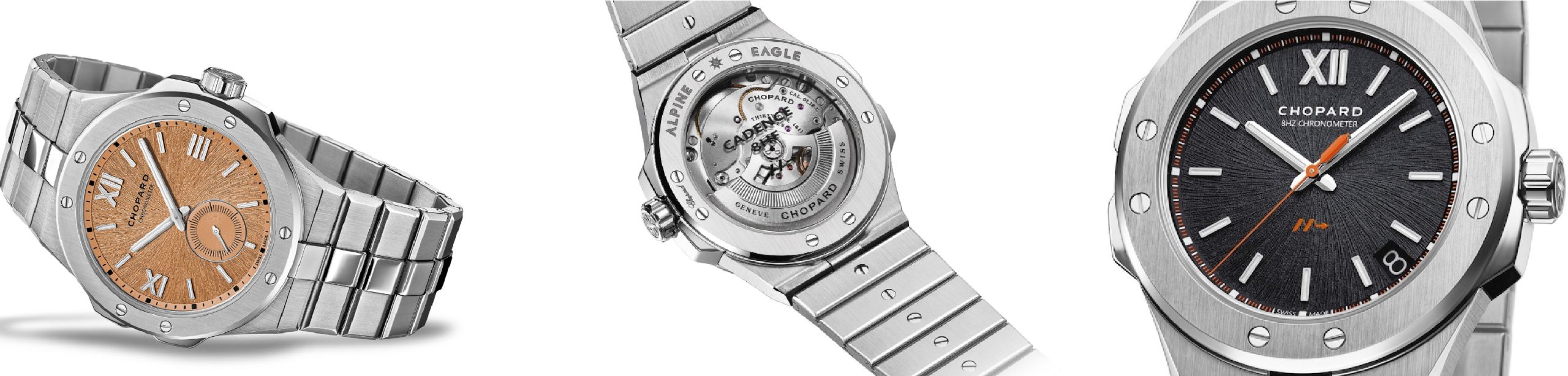 Alla versione 34 mm con quadrante salmone e cassa in titanio, si è affiancato un nuovo orologio, l’41 XPS Cadence BHF ø 41 mm, movimento automatico L.U.C 96.40-L, di soli 3,30 mm di spessore, carica 65 h, sul quadrante nero sul quale si intravede la sagome del Monte Rosa (ma c’è anche una versione con quadrante salmone) bracciale integrato in acciaio Lucent Steel™. EntrambI gli orologi con doppia certificazione di cronometro.