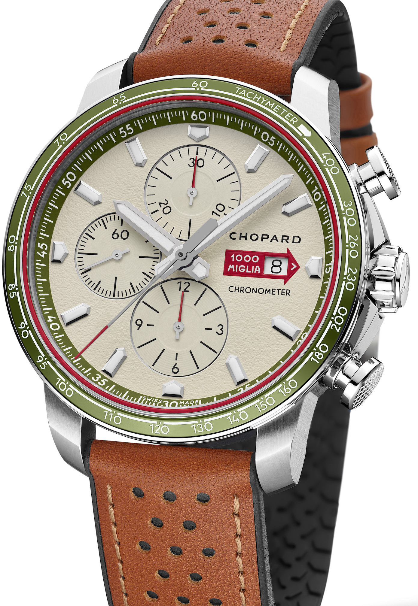 L’edizione limitata a 100 esemplari del cronografo cronometro in Lucent steelTM , ø 44 mm w.r. a m.100, con analoga lunetta, pulsanti e corona; la lunetta ha un inserto in alluminio verde oliva, colore impiegato anche per la minuteria e fra i due un filo rosso, sul fondello c’è il logo delle 1000 Miglia, sulla corona è inciso un volante; il quadrante è beige grainé e il movimento è a carica automatica.