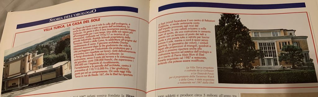 Quando lo conoscemmo, io e il collega-marito Disma Sutti ci occupavamo di sci e Mr Blum era sponsor di Salomon, produttore di sci, attacchi, scarponi e altri accessori. In seguito noi passammo a occuparci di motonautica e diventammo amici di Alberto Di Luca, Campione di Offshore. Negli anni ’80 Di Luca, CEO di Ebel Italia, insieme al Presidente Pierre Alain Blum fu ricevuto dal Presidente della Repubblica Francesco Cossiga. Anni dopo noi fummo invitati a Villa Turca, il celebre edificio disegnato nel 1916-17 dal giovane architetto Jean Edouard Jeanneret per l’industriale Anatole Schwob, proprietario degli stabilimenti di orologi Tavannes e Cyma. Costruzione che fu all’origine di una lite giudiziaria perché il costo del preventivo venne ampiamente superato e l’architetto non solo lasciò la Svizzera, ma cambiò anche il nome in Le Corbusier. Blum aveva acquistato la villa, restaurandola e alla fine degli anni ’80 ne fece il Centro di pubbliche relazioni dell’azienda.