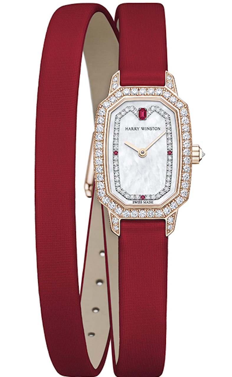 E delizioso il modello mini, che ai diamanti su cassa, anse e lunetta, affianca anche un’altra pietra preziosa e, nello stesso color rubino, sceglie un cinturino in satin con doppio giro sul polso., ma l’offerta vede anche altri colori (per esempio il bianco così estivo o il nero sempre elegante) e anche il bracciale in oro. I quadranti sono lavorati a sunray o offrono l’iridescenza della madreperla, il logo in oro e la pietra taglio smeraldo a ore 12 attirano l’attenzione, le altre tre pietre segnano le ore 3, 6 e 9 interrompendo così l’incastonatura dei diamanti che in parte riprende a forma della cassa.