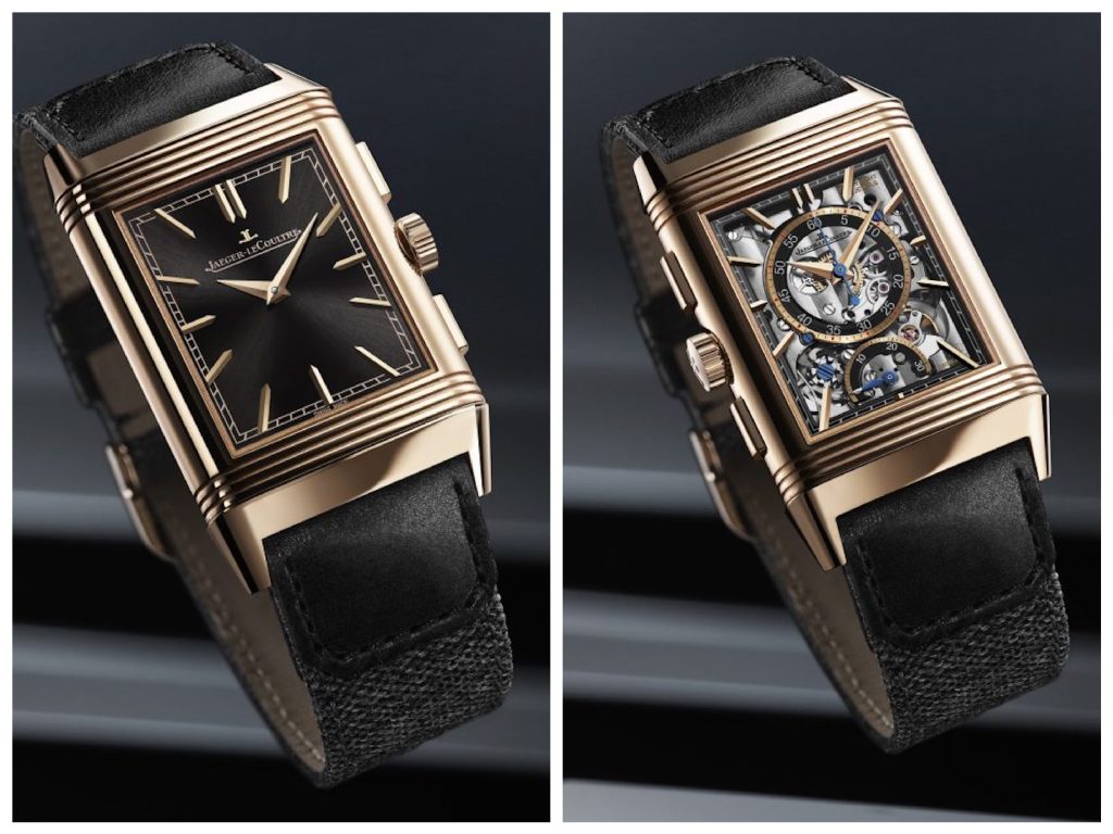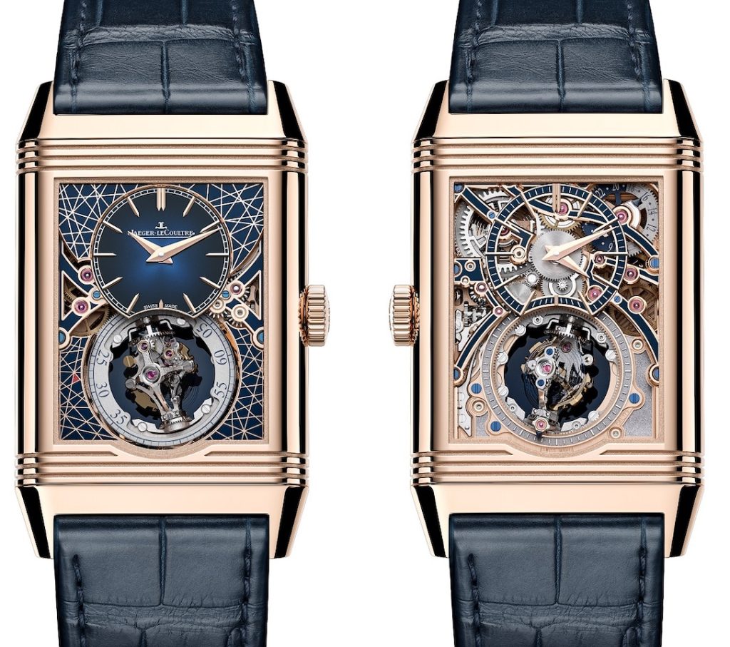 il nuovo Calibro di Manifattura 860: carica manuale portata a 52 h, A/h 28.800, cronografia integrata con ruota a colonne a innesto orizzontale – quello verticale non avrebbe consentito lo spessore voluto – consente la seconda visualizzazione dell’ora. Su entrambi i lati dell’orologio ore e minuti sono indicati dalle lancette che ruotano in senso orario e quindi in due modi diversi. Il quadrante della cronografia è scheletrato per far ammirare i componenti in funzione, quello principale di un nero profondo sembra essere quello di un normale Reverso, solo i pulsanti sul lato della cassa ne rivelano discretamente l’eccezionale meccanica. Tradizionale la decorazione dei componenti; ponti decorati con motivo Côtes de Genève, contatori neri per offrire una leggibilità ottimale, viti azzurrate come le lancette blu. Il Reverso Tribute Chronograph può essere scelto con la cassa, mm 29,9 x mm 49,4 in oro rosa oppure in acciaio. In questa versione il quadrante blu-grigio trattato ALD, si accorda al cinturino blu mentre per l’oro rosa il cinturino è nero.