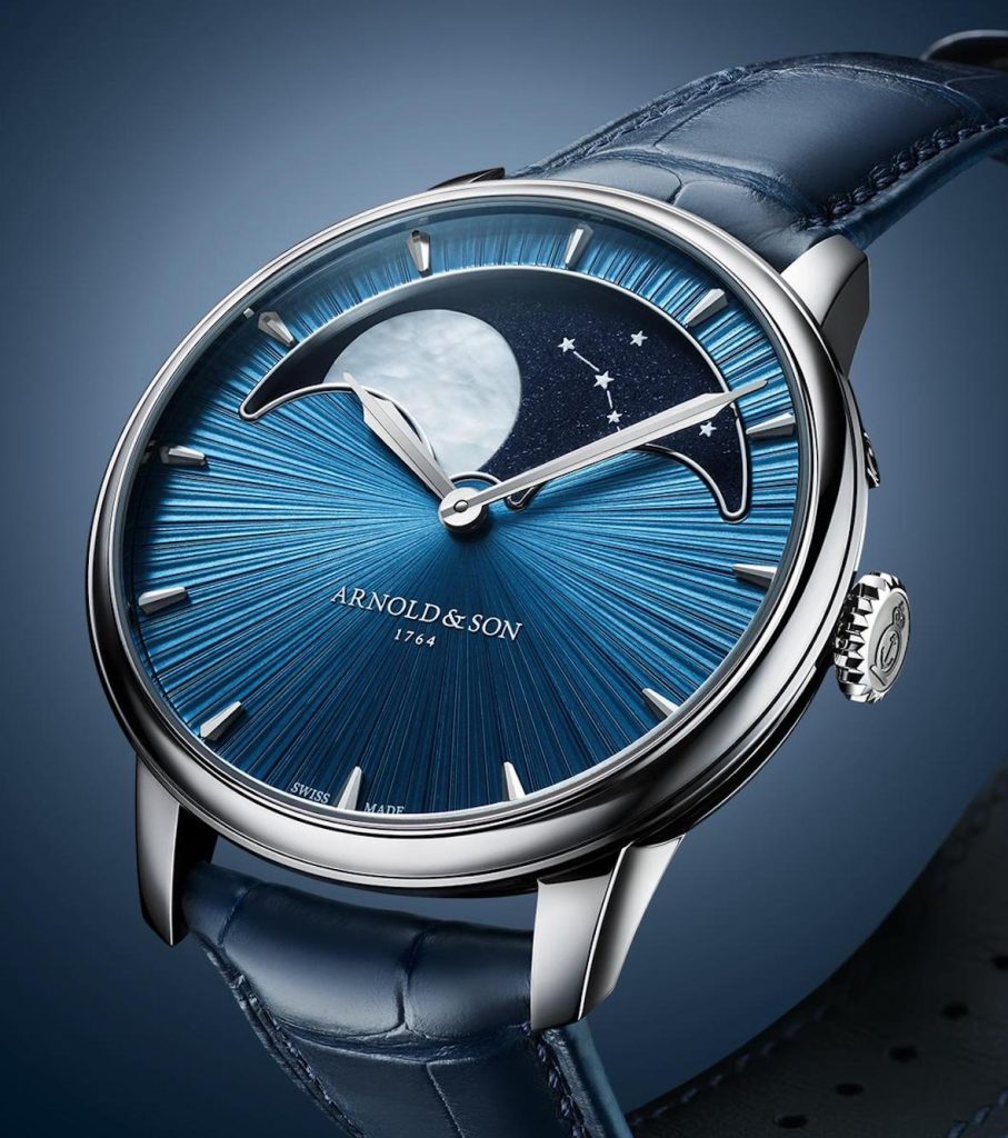A platinum case, ø 41,5 mm, and a wonderful exclusive dial for new Celestial Blue by Arnold & Son. Hand wounded mechanical movement Caliber A&S1512, grants power 90 h with two barrels.