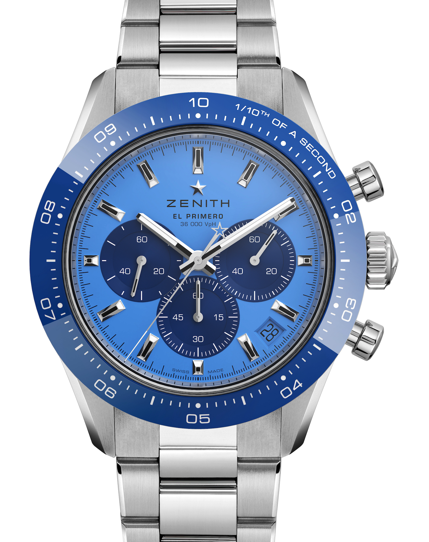 ZENITH – Sono quattro i modelli unici del Chronomaster Sport riuniti in un cofanetto con i colori di OW, con quattro custodie in pelle colorata, per ogni versione. Qui pubblichiamo la versione azzurra, le altre sono nei colori rosso, giallo e verde. Il movimento di Manifattura El Primero 3600 Automatico (A/h 36.000, precisione al decimo di secondo sulla lunetta e sul quadrante laccato) è visibile dal fondo in vetro zaffiro; mostra la ruota a colonne blu e un rotore aperto caratterizzato dalla stella a cinque punte di Zenith. Sul fondello presenta un’incisione “Unique Piece”. La cassa ø 41 mm in acciaio inossidabile è w.r. a 100 m. A chi acquisterà il cofanetto, Zenith offre un’offerta esclusiva, il soggiorno di una settimana nel Sud della Francia, all inclusive presso l’Academy del celebre tennis coach, nonché Friend of the Brand, Patrick Mouratoglou, compresa ua sessione di allenamento con il celebre allenatore.