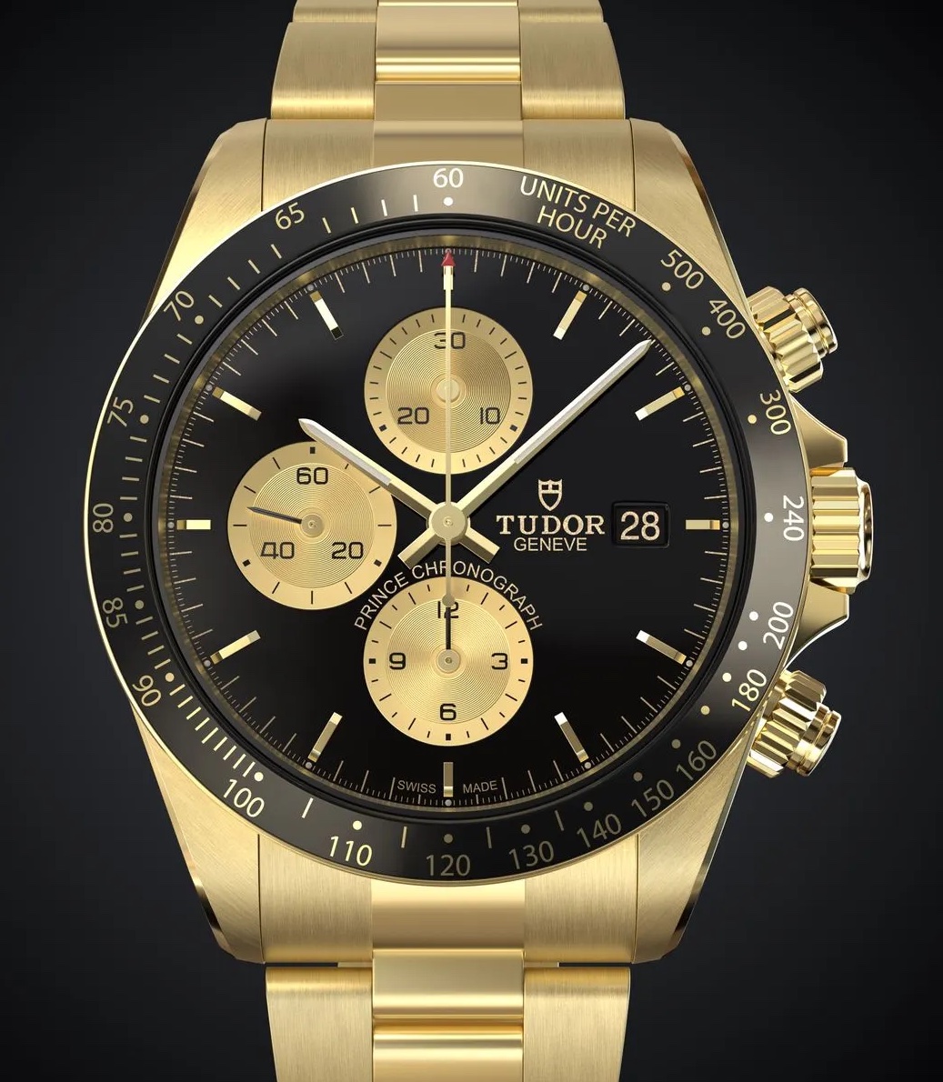 TUDOR – L’ispirazione deI Prince Cronografo One arriva dai ricordi (attualizzati) degli anni Settanta. La cassa ø 42 mm, spessore mm 13,7 è in oro giallo, con bracciale analogo, ma è w.r. a m.200. Il movimento di Manifattura, Calibro MT59XX, è un prototipo, diverso dal calibro impiegato attualmente realizzato in partnership con Breitling. Ovviamente è automatico, A/h 28.800, carica 70 h. Quadrante nero con contatori dorati. Nelle precedenti edizioni di OW Tudor, ha ottenuto ottimi risultati con rilanci in asta sino ad arrivare a cifre molto alte: nel 2015 un Black Bay in bronzo venne battuto a 350,000 CHF, stessa cifra anche nel 2019 per il Black Bay Ceramic .