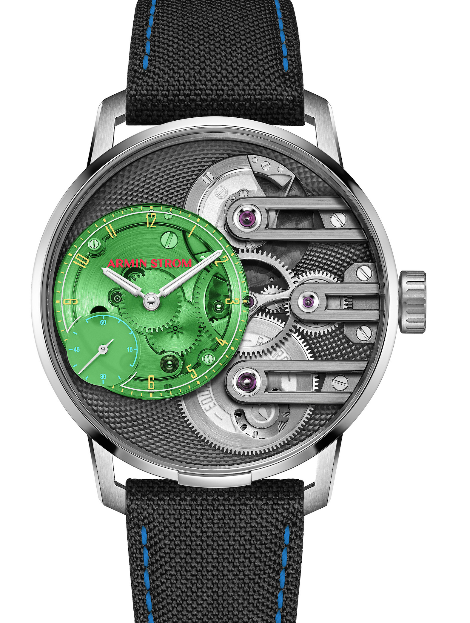 ARMIN STROM – Il Gravity Equal Force, realizzato in house dal Marchio ceduto molti anni fa da Armin Strom, ha la platina nera incisa dall’atelier di Karl Voutilainen e altre finiture d’alta orologeria. La cassa ø 41 mm è in acciaio e sul quadrante un disco decentrato in vetro zaffiro verde, per ore, minuti e secondi, attira l’attenzione insieme agli altri colori di OW. Il movimento di Manifattura è il Calibro AB19 a carica automatica con microrotore e trasmissione a forza costante.