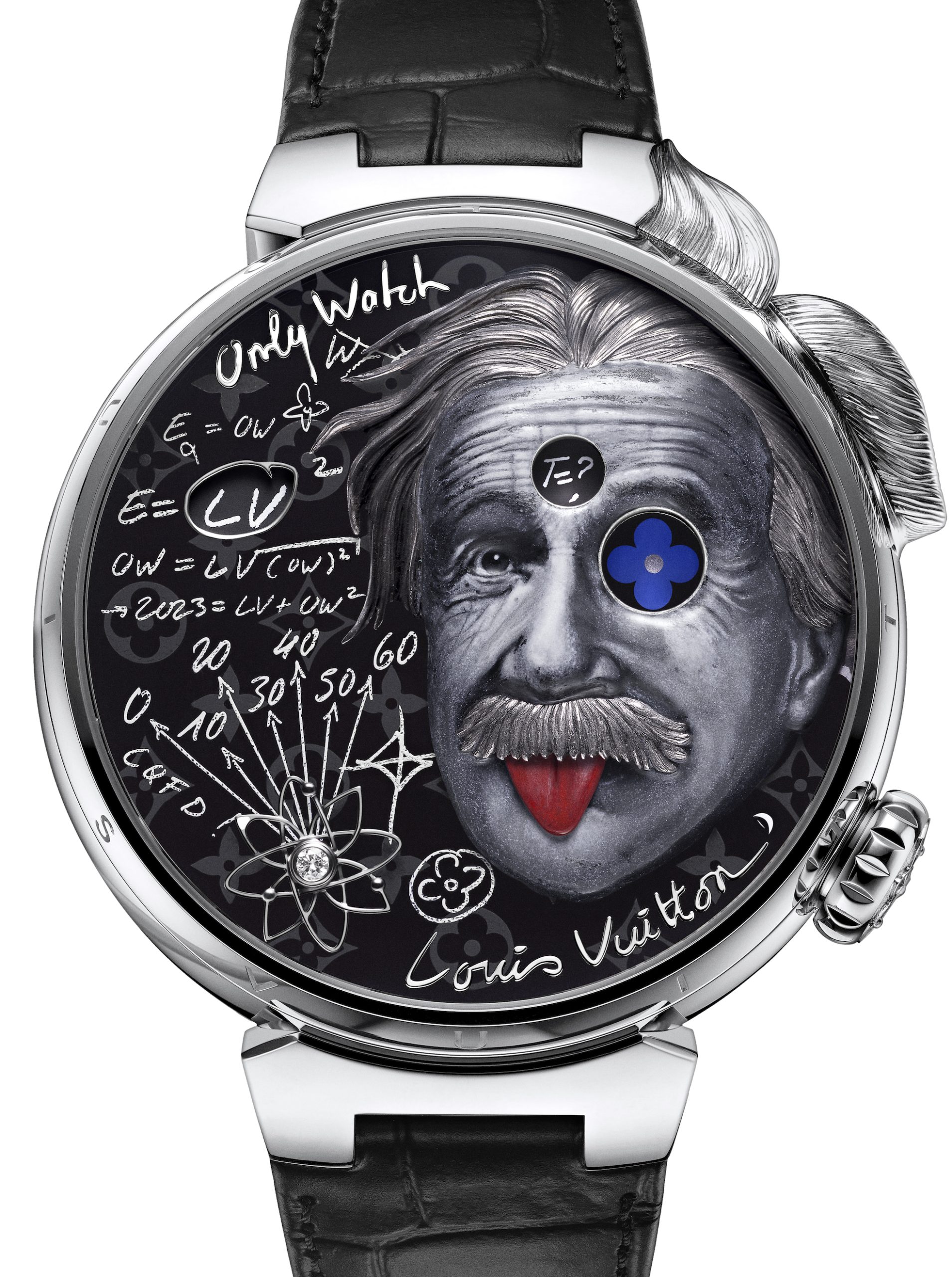 LOUIS VUITTON – Siamo arrivati all’ultimo orologio da polso per OW, è il Tambour Einstein Automata ideato, sviluppato e realizzato a Ginevra negli stabilimenti di Louis Vuitton e presenta l’impiego di molte tecniche orologiere: microscultura,smalto grisaille e incisioni in oro, colori per il ritratto del grande scienziato che sicuramente non avrebbe mai pensato di arrivare un giorno anche sul quadrante di un orologio.