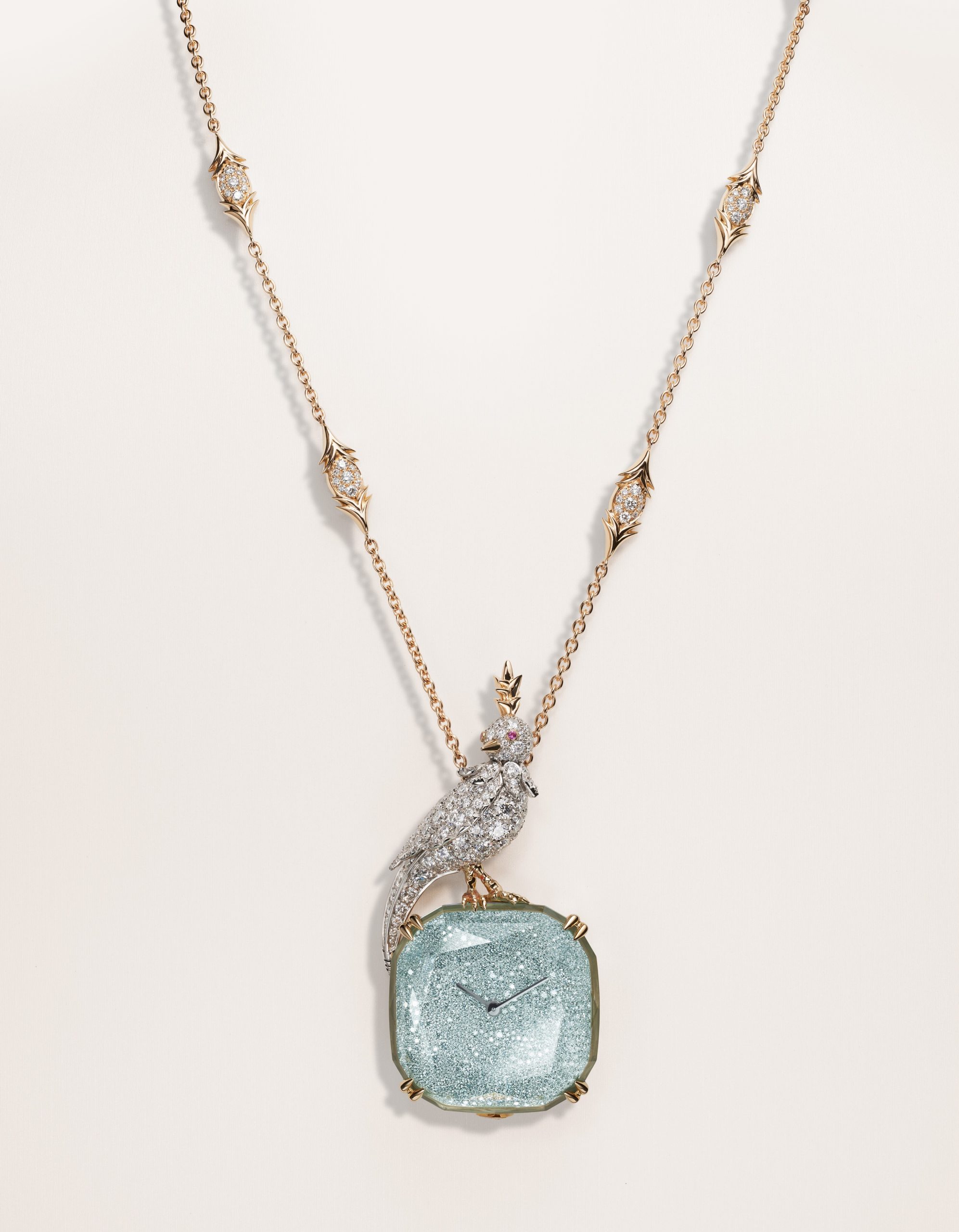 TIFFANY – Anche da Tiffany un prezioso orologio a pendant sovrastato dal tradizionale “Bird on Rocks” della Maison. Cassa in oro giallo ø 27 mm x 27 spessore 11,6 mm, con vetro in acquamarina sfaccettato, sul quadrante diamanti incastonati a neve; la scultura del volatile è in platino e oro giallo con diamanti e gli occhi sono in zaffiri rosa. Il movimento è a carica manuale, Calibro LTM2000, riserva di carica 38 h, 21 rubini. Collana in oro giallo e diamanti, lunga cm 50.