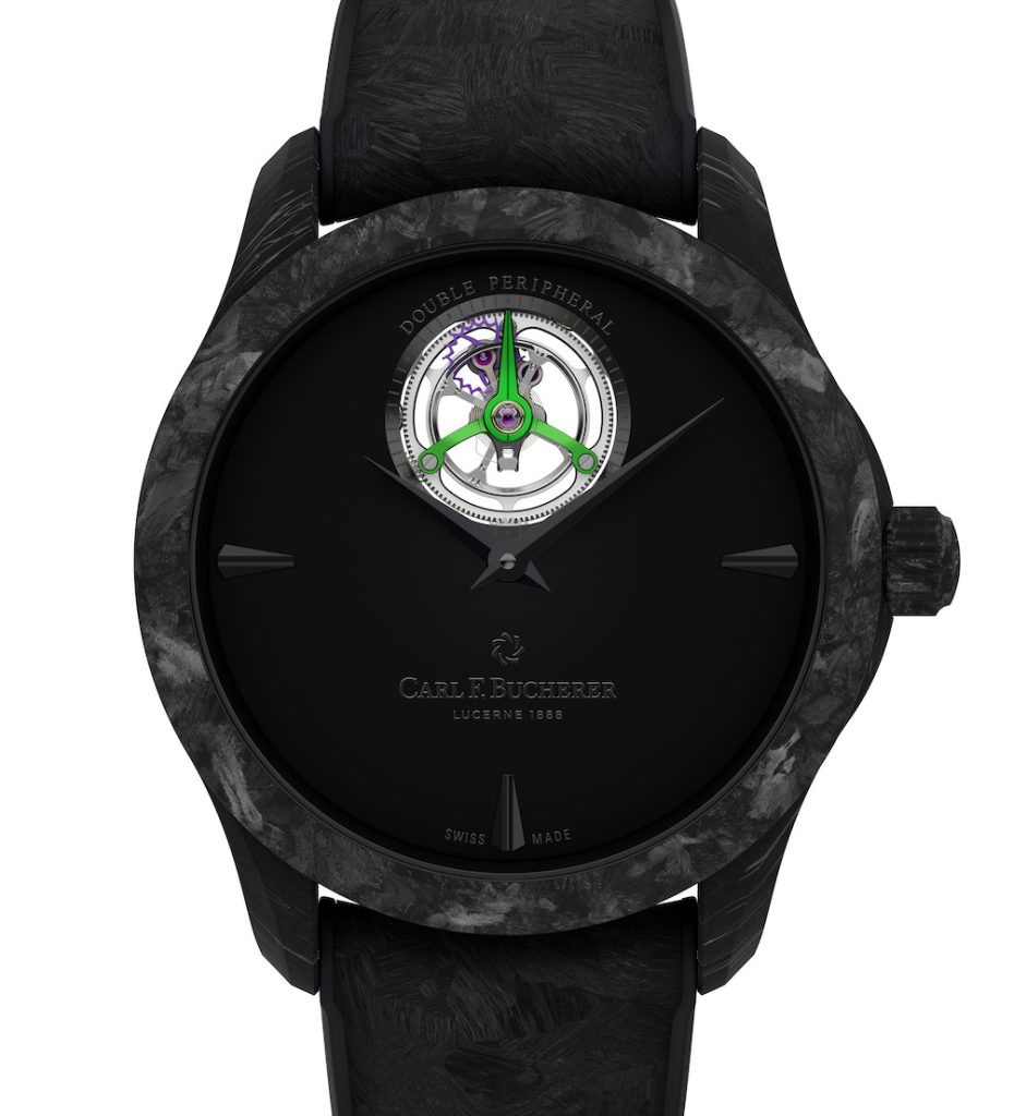 CARL BUCHERER – Il Manero Tourbillon Double Peripheral ha una cassa in titanio e carbonio ø 43,1 mm; sul quadrante a cupola nero opaco indici a cuneo in oro, il movimento di Manifattura è il Calibro CFB T3000 a carica automatica, certificato Chronometro dal COSC, scappamento a tourbillon volante (visibile a ore 12 con elementi verdi, uno dei colori di OW), 33 rubini, diametro 36.5 mm spessore 4.6, riserva di carica 65 h, stop secondi. Cinturino in pelle e caucciù con sistema di cambio rapido.