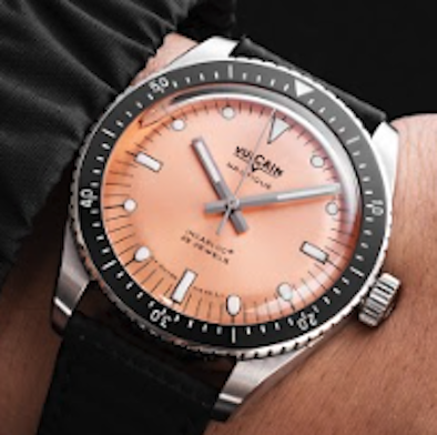 Vulcan for its SkinDiver unweils a pink samon dial, stailess case w.r. 200 m black Ceramic bezel and selfwinding Swiss movement (ETA 2824).