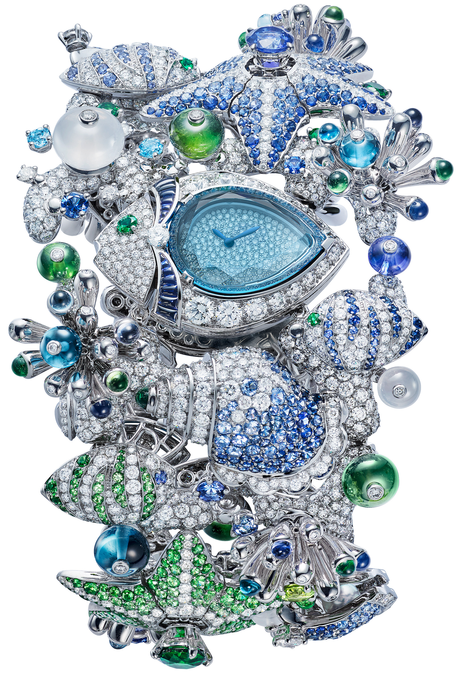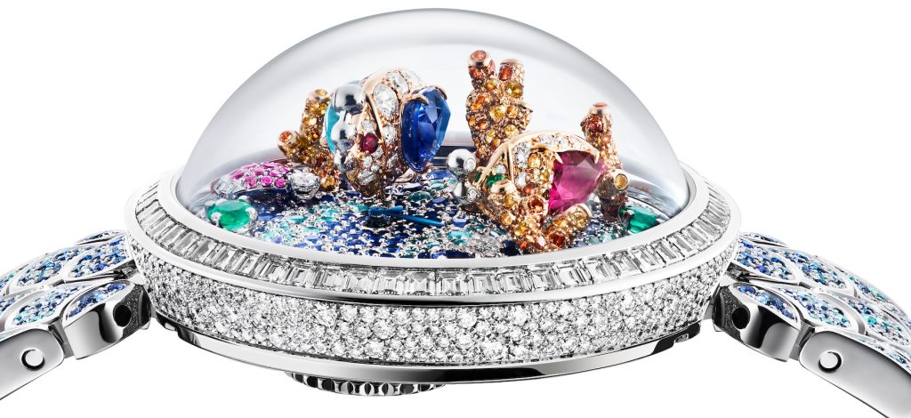 Il tema dei giardini e dei colori è interpretato in due versioni. Nel Divas’ Dream Acquarium Ref.103866, il Giardino è quello che si può incontrare non solo sul fondo del mare, ma ricreandolo in un acquario casalingo. Ci vuole un bel po’ di fantasia per aver ideato questo orologio che, sotto il vetro a cupola, custodisce sul quadrante con pavé di tormaline Paraiba, zaffiri blu, gialli, due smeraldi tondi e diamanti, presenta pesci e anemoni incastonati in una rubellite in uno zaffiro e una tormalina Paraiba con granati mandarino; la conchiglia è realizzata con zaffiri rosa. La cassa ø 38 mm in oro bianco e la lunetta sono impreziosite con diamanti che sulla carrure sono incastonati a neve. Pietre preziose anche sul bracciale di 170 mm in oro bianco con pavé di tormaline Paraiba, zaffiri e diamanti. Il movimento meccanico di Manifattura a carica manuale è il Calibro Piccolissimo.