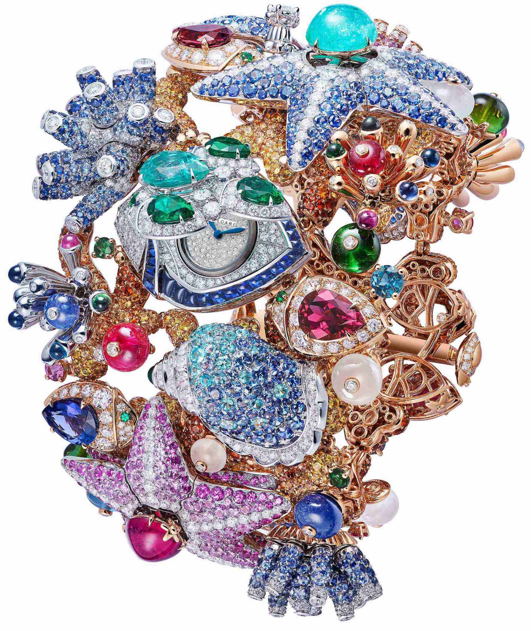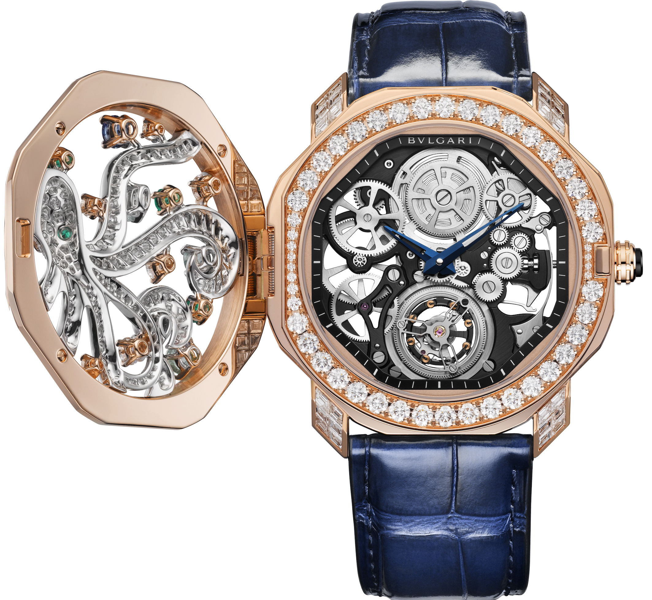 Octo Roma Mediterranea è un orologio segreto. Sul coperchio in oro bianco e rosa, brillano diamanti, zaffiri rosa tondi e taglio a pera, smeraldi tondi e tormaline Paraiba, formando un disegno legato al mare con un grande polipo; cassa ø 44 mm in oro rosa, con analoga corona con inserto in titanio nero DLC; cinturino in alligatore blu e fibbia pieghevole incastonata di diamanti. Il movimento meccanico ultra-sottile di Manifattura scheletrato è il Calibro BVL 268SK a carica manuale con tourbillon volante (spessore 1,95 mm, carica 52h, A/h 21’600).