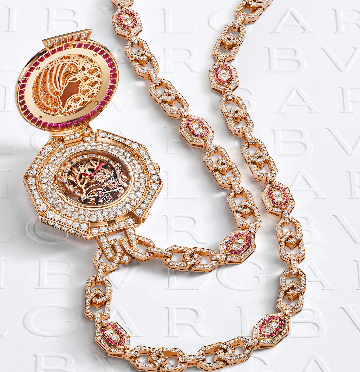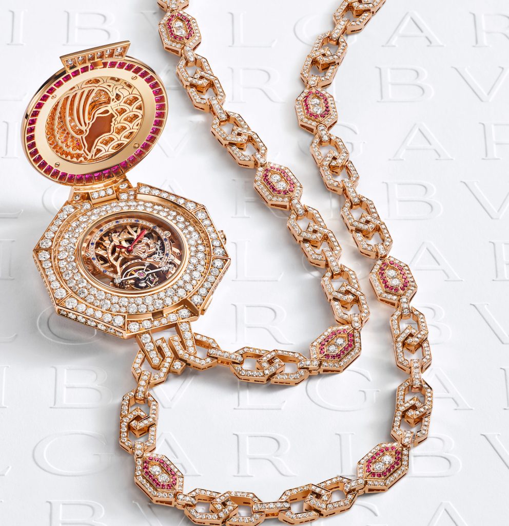 Degna di risplendere sulle toghe ducali con diamanti, rubini e i suoi 90 centimetri, anche la collana-orologio segreto Cammeo Imperiale; la cassa ø 56 mm è in oro rosa; sull’interno del coperchio il profilo di Cleopatra, sul quadrante tra i diamanti e zaffiri blu risalta la gabbia del Tourbillon Lumiere; il movimento meccanico di Manifattura scheletrato è il Calibro BVL208 a carica manuale con tourbillon, 64 ore di riserva di carica, A/h 21’600).