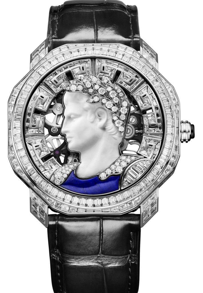 Terminiamo con un Octo segreto dedicato ai polsi maschili e allo splendore dell’Impero Romano con il profilo dell’Imperatore (e non di Cleopatra); da notare la corona di alloro che qui è realizzata con diamanti bianchi di misure diverse, come il modello con il polipo pubblicato in apertura, sotto il coperchio si ammira il movimento meccanico ultrapiatto scheletrato a carica manuale, Calibro BVL 268 SK con tourbillon volante.