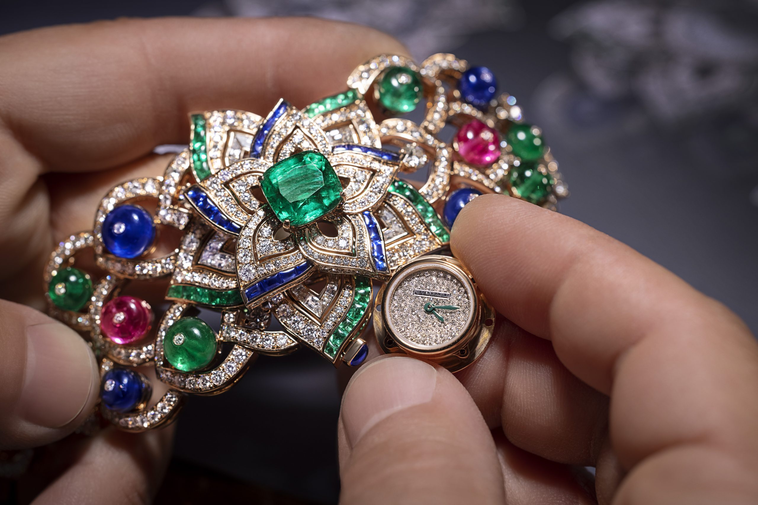 Nell’orologio segreto di Alta Gioielleria Oriental Buds, Fabrizio Buonamassa rivela la sua passione per le pietre preziose (uno smeraldo centrale taglio cuscino (Colombia, 5,56 ct), bead di tormaline rosa (3,64 ct), smeraldi (11,58 ct), zaffiri blu (12,83 ct) smeraldi buff-top (2,77 ct), zaffiri blu buff-top (2,87 ct), diamanti rotondi taglio brillante (13,58 ct) e baguette (1,75 ct). La cassa è in oro rosa, il quadrante con pavé di diamanti e il bracciale lungo 155 mm; però il movimento al quarzo.