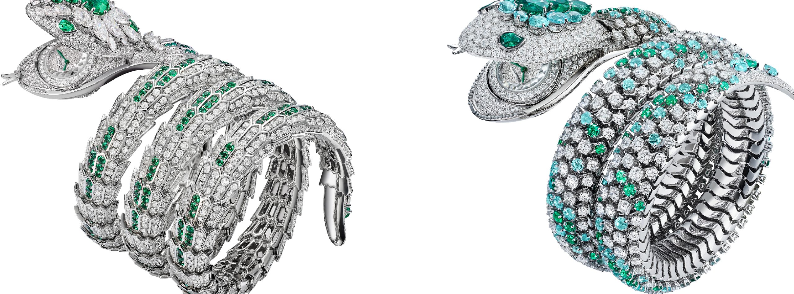 Non potevano mancare i Serpenti misteriosi interpretati in due versioni: Dragone, a sinistra con la testa del drago che si apre premendo sulla lingua e Pallini dove il sistema di apertura è posto in alto, diverse le incastonature delle pietre preziose, diamanti e smeraldi, sui bracciali in oro bianco; il movimento è il Calibro Bvlgari Piccolissimo. Nel 2023 questi preziosi segnatempo, a tema Serpenti, festeggiano il loro 75° anniversario.