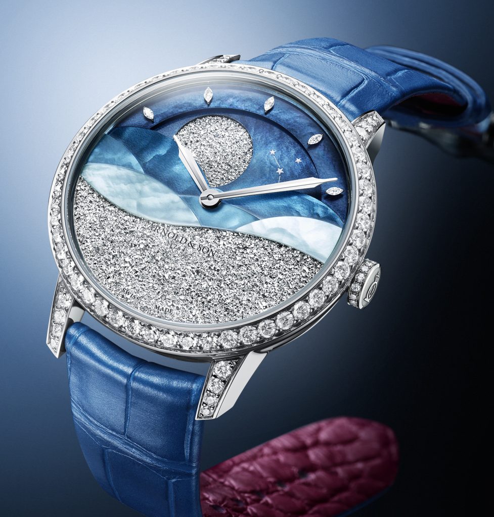 Per i polsi femminili il Perpetual Moon 38 Mintnight ha una luna su un cielo verde menta che viene vista dalla terra, su uno sfondo di colline blu-verde menta-turchesi. Sulla cassa (protetta da vetro zaffiro anche sul fondello) e sulle anse in oro bianco risplendono 80 brillanti e 22 sono sulla fibbia in oro bianco; sul quadrante lw decorazioni sono in cristalli di rutenio, le costellazioni sono dipinte a mano, cinque diamanti taglio marquise indicano l’ora. Il Calibro A&S1612 è a carica manuale, ha una riserva di carica di 90 ore e 24 rubini. Gli esemplari di questo orologio da favola sono 18 e possiamo anche dire che è stato selezionato fra i sei orologi da polso Ladies che prenderanno parte al prossimo G.P.H.G.