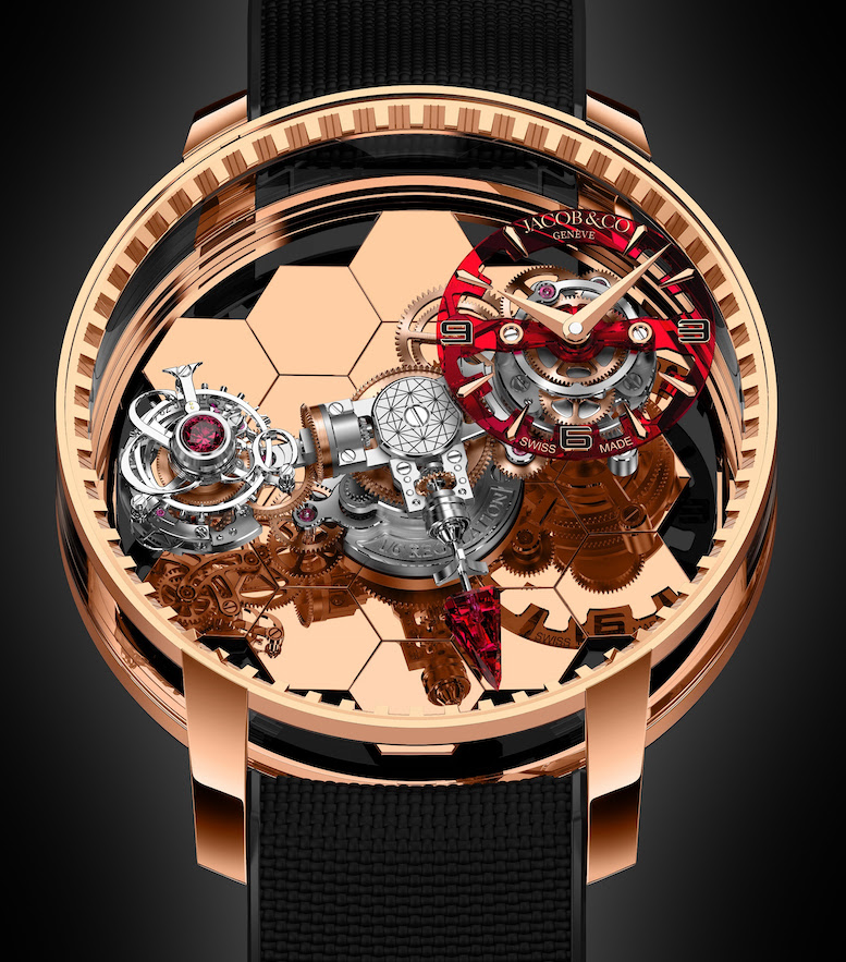 Per la prima volta sono stati adottati due grandi bariletti in grado di trasmettere la forza necessaria al funzionamento; un dispositivo apposito consente di ottenere una forza costante (in attesa di brevetto) con una frequenza di 1/6 di secondo. La rotazione in un minuto ha influito anche sulla lancetta dei secondi, in acciaio a forma di freccia, che sulla parte finale in platino incastona un rubino sintetico; la gabbia del tourbillon volante ruota in un minuto sul suo asse e in 15″ sul secondo asse, facendo così ruotare molto velocemente sul terzo asse le superfici specchiate. Le due corone, di carica e per la messa all’ora, sono sul retro dell’orologio. Il Calibro esclusivo Jacob & Co a carica manuale ha uno spessore di mm 19,30, i rubini sono 53, le A/h 21.600, carica 36 h; la base presenta i 18 esagoni in oro rosso 5N lucido, le lancette Dauphine di ore e minuti sono in oro. Il cinturino nero è in Cordura® e caucciù con fibbia ad ardiglione in oro rosa.