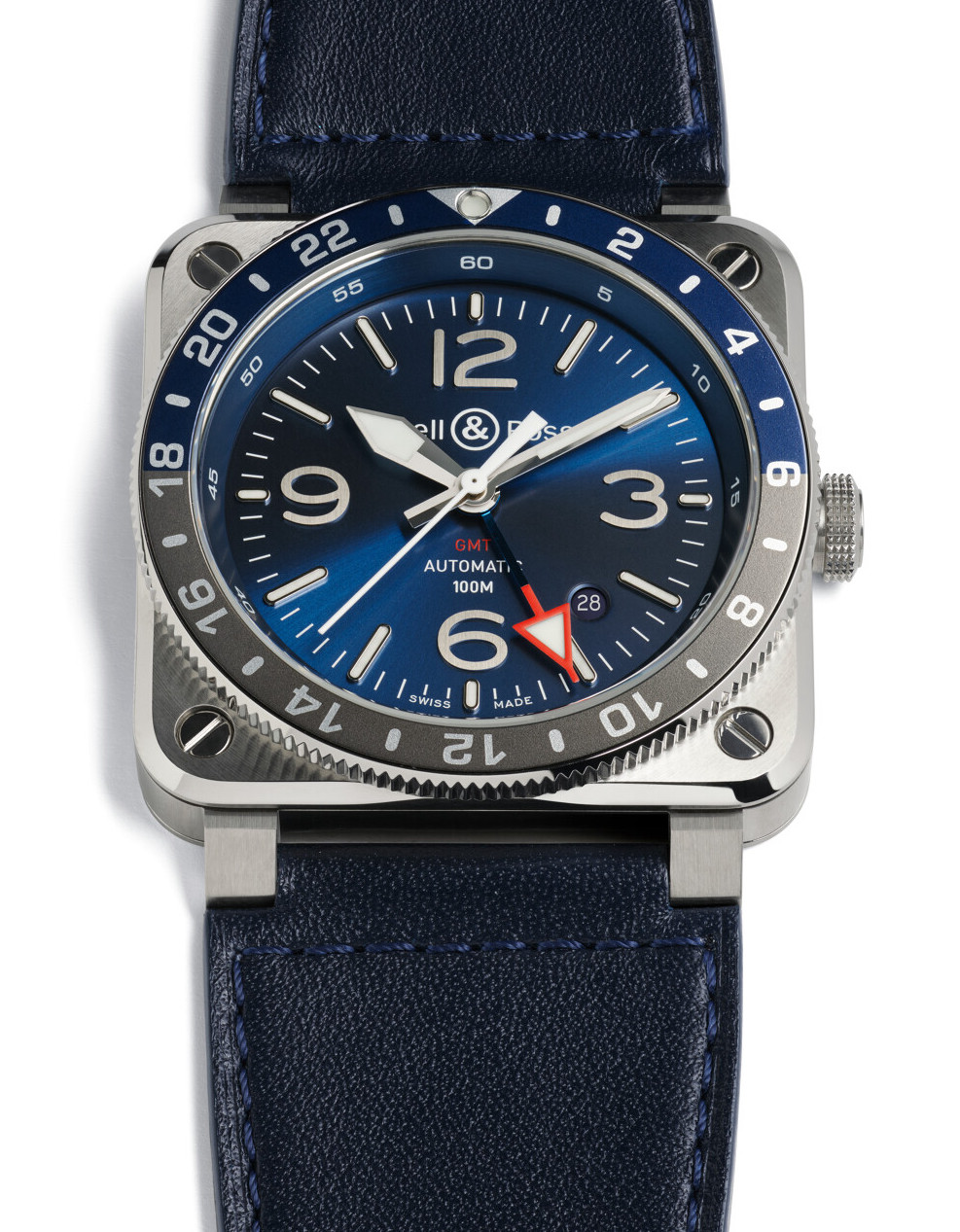 La lavorazione a soleil del quadrante blu, sulla lunetta bidirezionale 24h in acciaio si affianca al grigio chiaro per le ore diurne e al blu per quelle della notte. Il vetro zaffiro è antiriflesso, gli indici sono trattati SLN White 10 X1 con emissione verde, il colore luminescente più efficace in ambiente buio; le lancette di ore, minuti e delle 24 h sono in metallo scheletrato riempito di Super-LumiNova®; la punta di quella del secondo fuso orario è un triangolo rosso; sulla lunetta bicolore l’ora locale è indicata sulla scala graduata di 24h. La cassa in acciaio ø 42 mm è w.r. a m. 100 metri; il movimento automatico BR-CAL.303 ha 25 rubini, 28.800 A/h e una riserva di marcia di circa 42 ore. Il cinturino in vitello Nappa Soft blu e tela sintetica ultraresistente nera, con cuciture tono su tono, si allinea alla sfumatura del blu che riveste la lunetta in acciaio e al quadrante lavorato a raggi di sole.