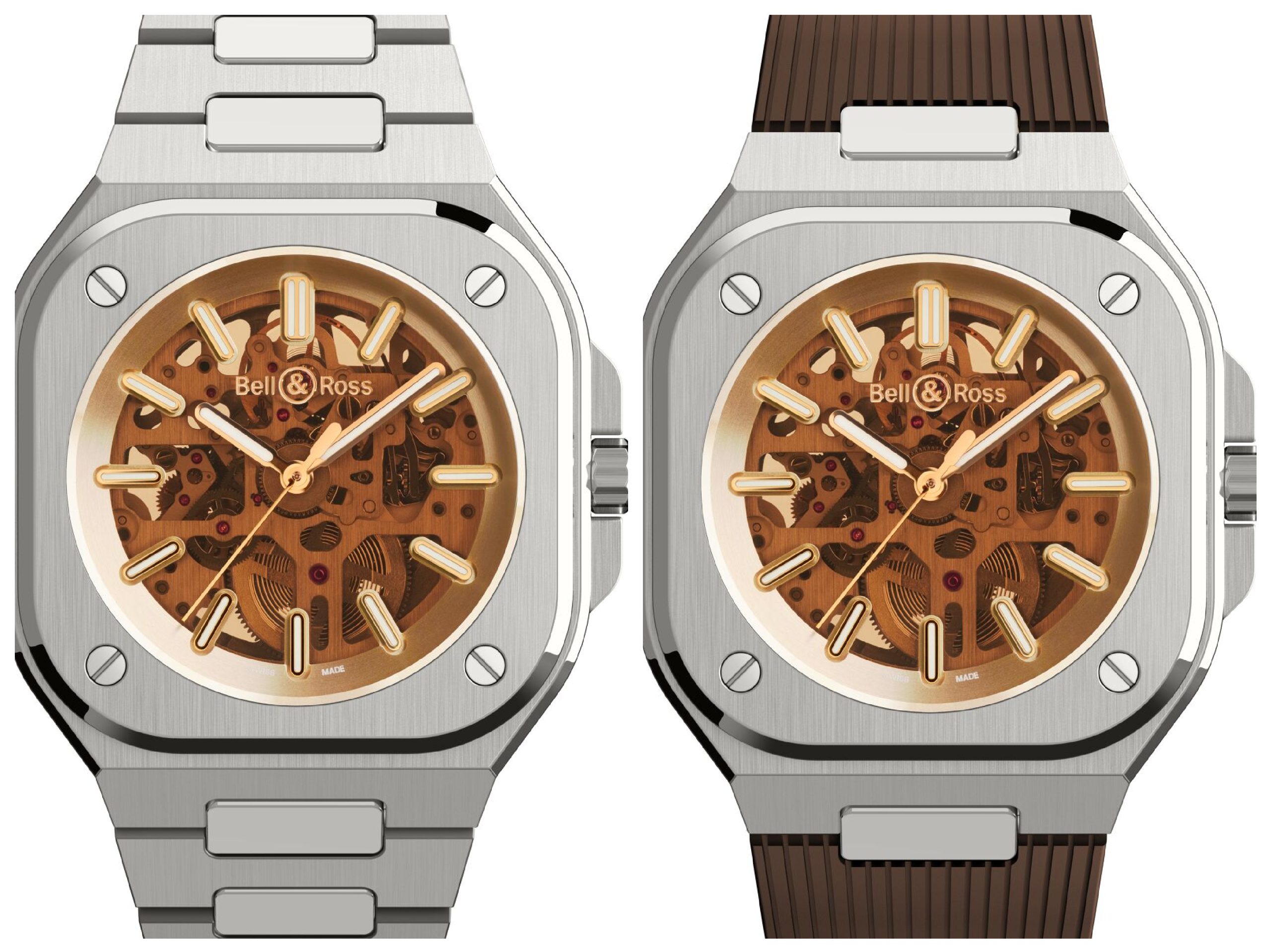 Br-05 collection has a skeleton movement and a golden dial giving a new look to selwinding Swiss Made BR-CAL.322.
