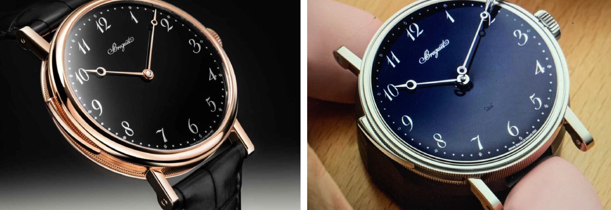 Il quadrante di entrambe le versioni è in smalto Grand Feu sul quale risaltano indici arabi Breguet e minuteria in argento, cosiddetto “cipriato”, tradizionali le lancette a “pomme” di Breguet in oro, c’è anche la famosa firma “segreta” del Maestro perché anche nei secoli passati i falsari erano sempre in agguato. Il cursore di avvio per la Ripetizione è sulla carrure a ore 9. Sulla cassa in oro rosa il quadrante è nero sull’oro bianco invece è blu notte; i cinturini sono rispettivamente in alligatore nero o blu con fibbia deployante tripla in oro. Le tirature sono forzatamente limitate, per realizzare un orologio Ripetizione Minuti si impiega almeno un mese di lavoro.