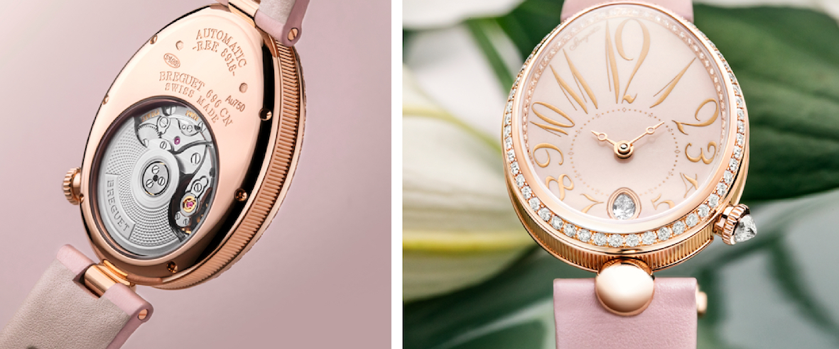 Raffinato e delicato con la cassa ovale in oro rosa, e il quadrante in smalto Grand Feu, il nuovo Reine de Naples 8918 ha la lunetta impreziosita con 118 diamanti, uno è incastonato a ore sei e uno sulla corona; il Calibro automatico di Manifattura 537/3, Hertz 3,5, carica 45 h, ha lo scappamento in silicio e la massa oscillante in platino con lavorazione guilloché realizzata manualmente dagli artigiani della Manifattura.