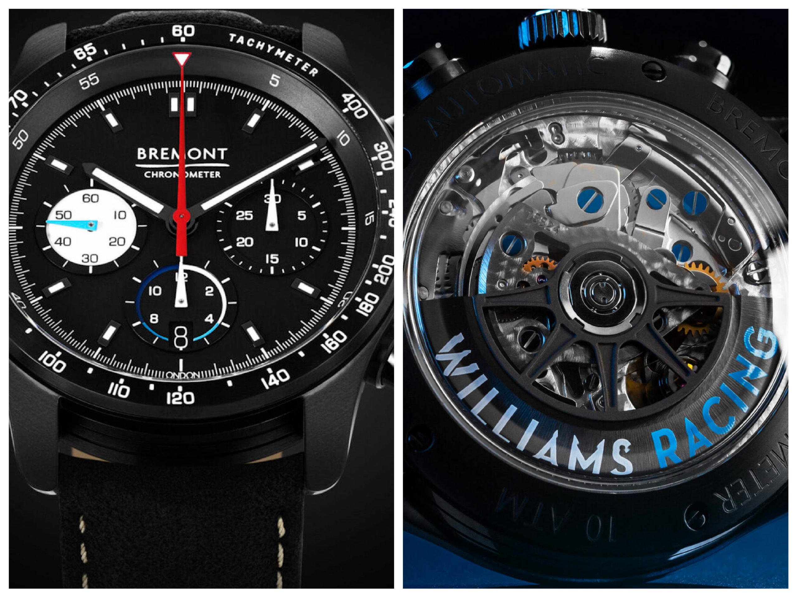 La tiratura è stata decisa in 244 esemplari in omaggio alle presenze dello chassis FW sul podio (in passato però – secondo WhatchPro – le presenze sul podio sono state 313), ma è un particolare che, forse, interessa solo chi acquista un orologio in tiratura limitata pensando di farne un investimento dato che meno esemplari sono disponibili, più cresce l’interesse. Per tutti gli altri il cronografo WR45 Limited Edition è un segnatempo imponente con la cassa ø 43 mm trattata DLC black e quadrante nero. Il movimento è il Calibro BE-50AE su base Valjoux 7750, certificato cronometro, che sul retro mostra il logo del Team in colore blu mentre la Marca Bremont è sul quadrante nero a ore 12. Il contatore bianco dei secondi cronografici ha la lancetta azzurra; lancette e indici al buio sono luminescenti di luce azzurra, infine sulla lunetta è incisa la scala tachimetrica.