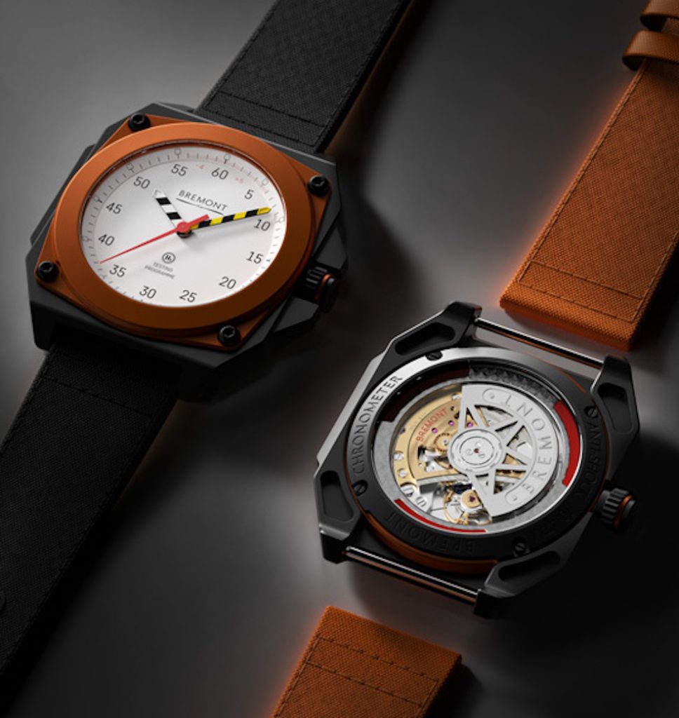 Le novità sono queste: l’orologio MB-Vyper dalla forma e dal colore insoliti e che sarà prodotto in 300 esemplari, è stato sottoposto a un accurato test di resistenza e durata. Per chi non lo sapesse la sigla MB si riferisce a Martin Baker, “prezioso collaudatore” dell’orologio. Il movimento è il Calibro ENG352 a carica automatica realizzato in house, che garantisce una carica di 65 h, ha la ruota scappamento in silicio, spirale libera, bilanciere a inerzia variabile ed è protetto, dal sistema antishock KIF con un anello in gomma che circonda il movimento. L’inedita forma della cassa (costruita in tre parti, Trip-Tick® ed impiegata da tutti i Bremont MB) misura mm 48 x 51,9 ed è stata ispirata da un supporto progettato da Bremont, per fissare lo strumento di prova ENG300 in posizione durante il test HALT (Highly Accelerated Life Testing); test completato poi in laboratorio da Martin-Baker. L’orologio completo di movimento è stato testato sul simulatore con accelerazione da 0 a 15 G a un’altezza di 100.000 piedi con temperatura -46/49°