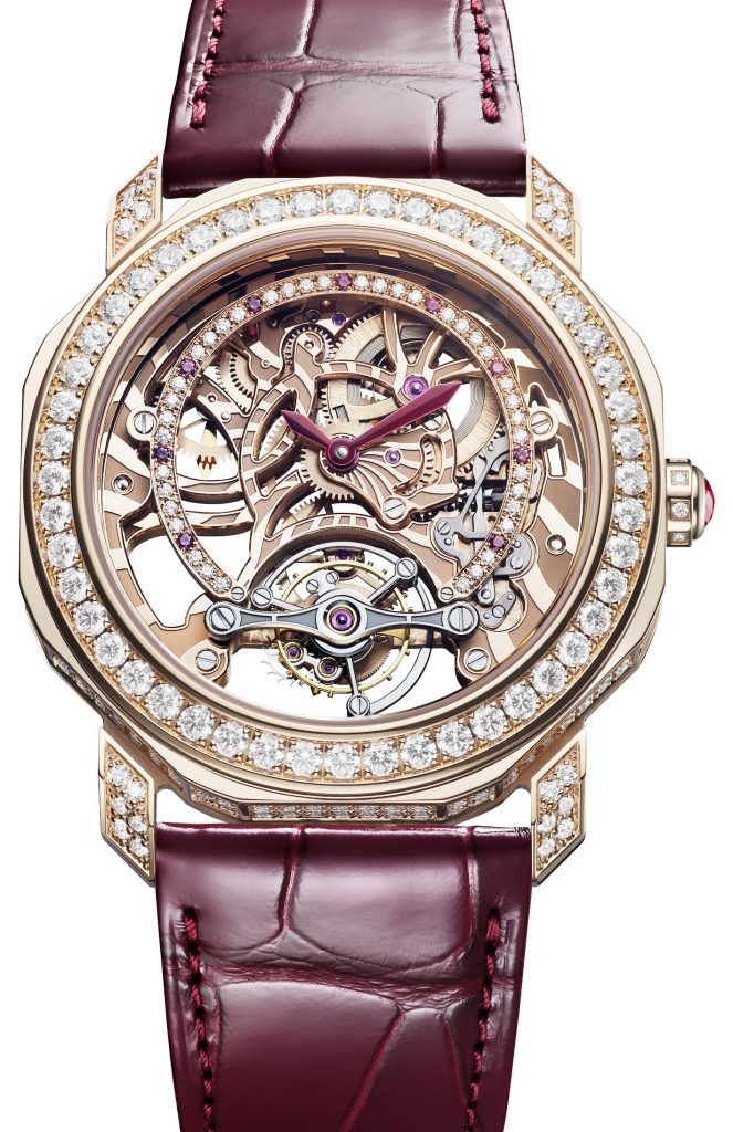 La cassa in oro rosa ø 38 mm incastona 267 diamanti tondi taglio brillante (2,48 cts), la lunetta ne incastona 48 dello stesso taglio(1,58 cts); sulla corona in oro rosa c’è un rubino cabochon. Il movimento in oro rosa decorato e scheletrato manualmente, è il Calibro BVL 208 a carica manuale con tourbillon. Sul quadrante aperto in oro rosa le ore sono indicate con diamanti e 9 rubini taglio brillante. Nota cromatica il cinturino in alligatore bordeaux con fibbia pieghevole incastonata con diamanti. Questi in totale i carati delle pietre preziose impiegate: rubini: 0,18 ct; diamanti 5,05 ct.