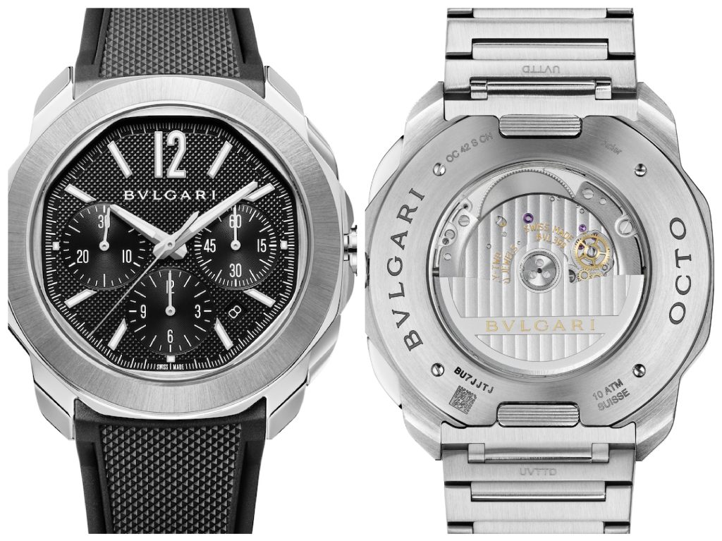 Sul cronografo si focalizzerà sicuramente l’interesse degli appassionati (il primo cronografo Octo equipaggiato con il Calibro BVL 328 le cui alternanze ora erano 36.000 risale infatti al 2014). Nella cassa in acciaio ø 42 mm, w.r. a m.100, il calibro automatico BVL 399 è un movimento Swiss Made di Manifattura con i contatori dei 30 minuti e delle 12 ore; dal fondo in vetro zaffiro mostra le raffinate decorazioni; il quadrantino dei piccoli secondi completa l’armonia della grafica. Il quadrante può essere scelto nel colore blu (crono Ref.103829) o nero (crono Ref.103471); la corona è a vite con inserto in ceramica, indici applicati e trattati Super-LumiNova® come le lancette. Entrambe le versioni sono completate dal bracciale in acciaio inossidabile lucido e satinato-spazzolato con chiusura pieghevole e sistema di intercambiabilità, ma nella confezione è incluso anche un cinturino in caucciù con fibbia ad ardiglione.