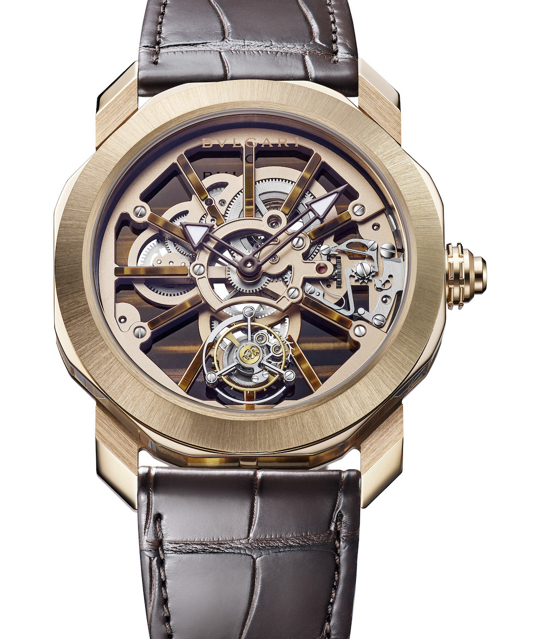 Terzo Tourbillon l’Octo Roma Precious Naturalia, Ref.103675, nella foto sopra, con cassa ø 44 mm in oro rosa satinato; ovviamente anche la corona e la fibbia pieghevole del cinturino in alligatore marrone sono in oro rosa. Il movimento è il Calibro di Manifattura a carica manuale BVL 206, ma rispetto agli altri ha inserito una lastra sottile di occhio di tigre che mostra analoghi indici posizionati sui ponti a sulla platina principale; il quadrante scheletrato lascia vedere bene la gabbia del tourbillon volante e gli altri ruotismi, tutti con finiture d’alta orologeria.