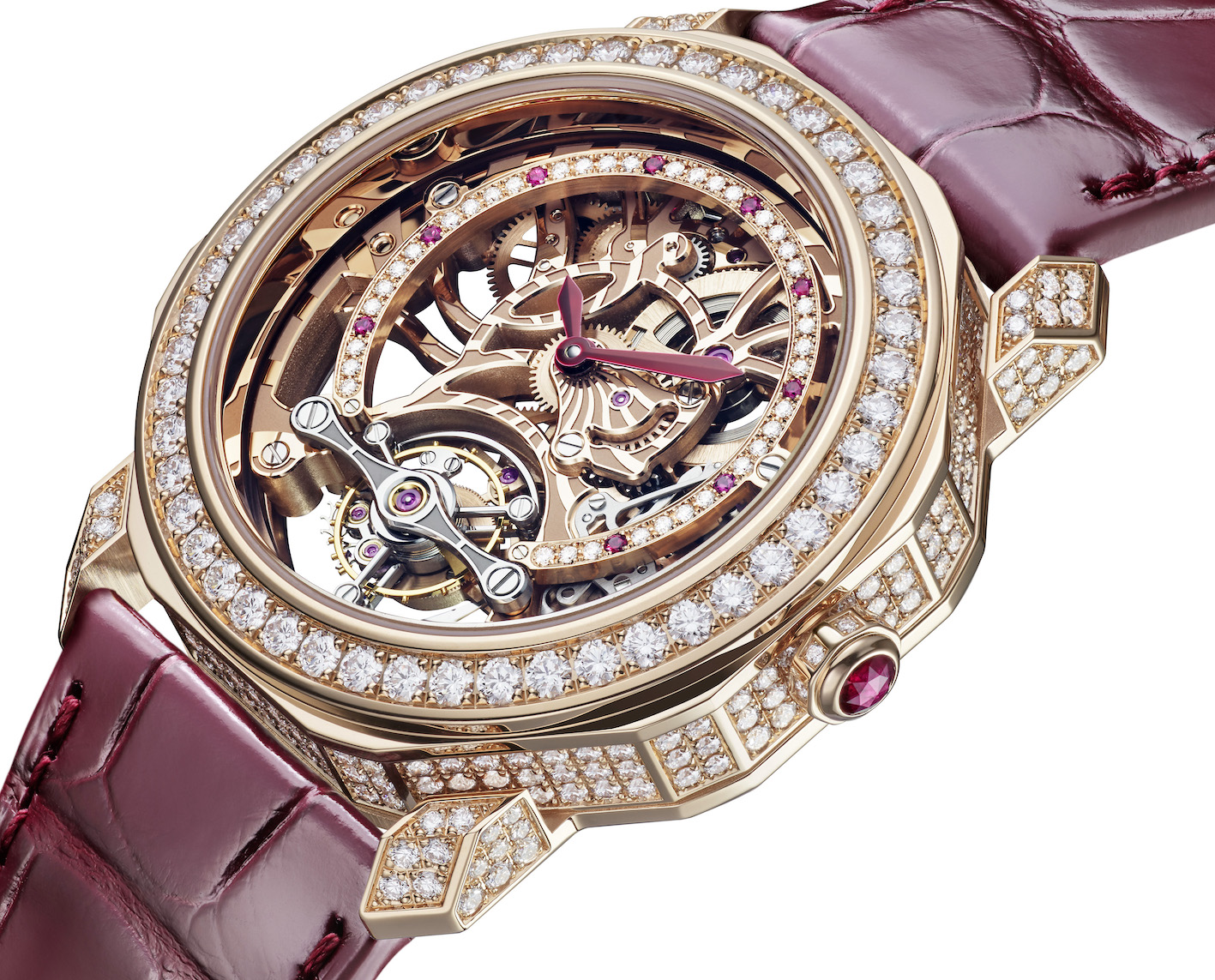 La cassa in oro rosa ø 38 mm incastona 267 diamanti tondi taglio brillante (2,48 cts), la lunetta ne incastona 48 dello stesso taglio(1,58 cts); sulla corona in oro rosa c’è un rubino cabochon. Il movimento in oro rosa decorato e scheletrato manualmente, è il Calibro BVL 208 a carica manuale con tourbillon. Sul quadrante aperto in oro rosa le ore sono indicate con diamanti e 9 rubini taglio brillante. Nota cromatica il cinturino in alligatore bordeaux con fibbia pieghevole incastonata con diamanti. Questi in totale i carati delle pietre preziose impiegate: rubini: 0,18 ct; diamanti 5,05 ct.